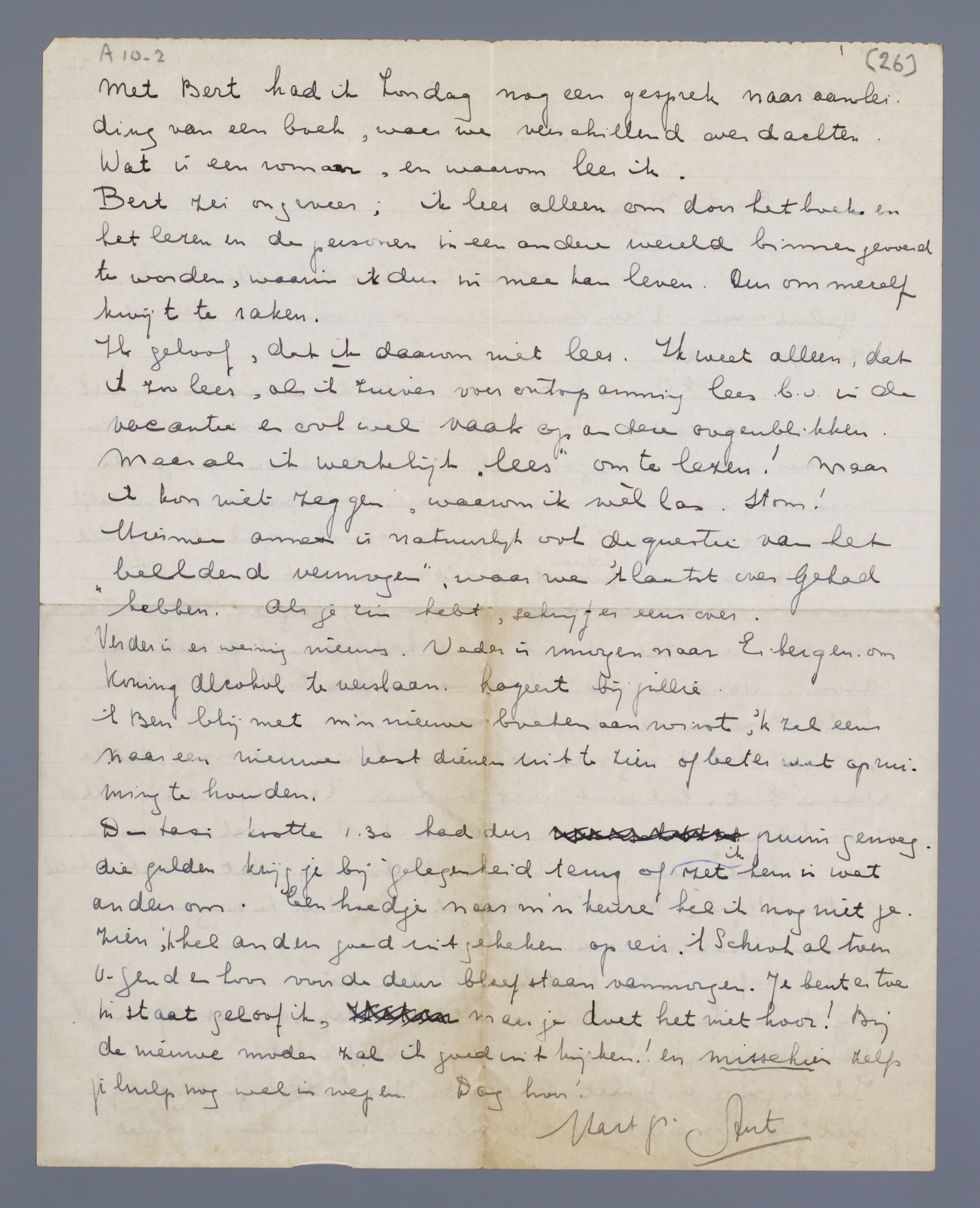 Ik geloof, dat ik daarom niet lees. Ik weet alleen, dat ik zoo lees, als ik zuiver voor ontspanning lees b.v. in de vacantie en ook wel vaak op andere oogenblikken. Maar als ik werkelijk ‘lees’ om te lezen! Maar ik kon niet zeggen, waarom ik wèl las. Stom!