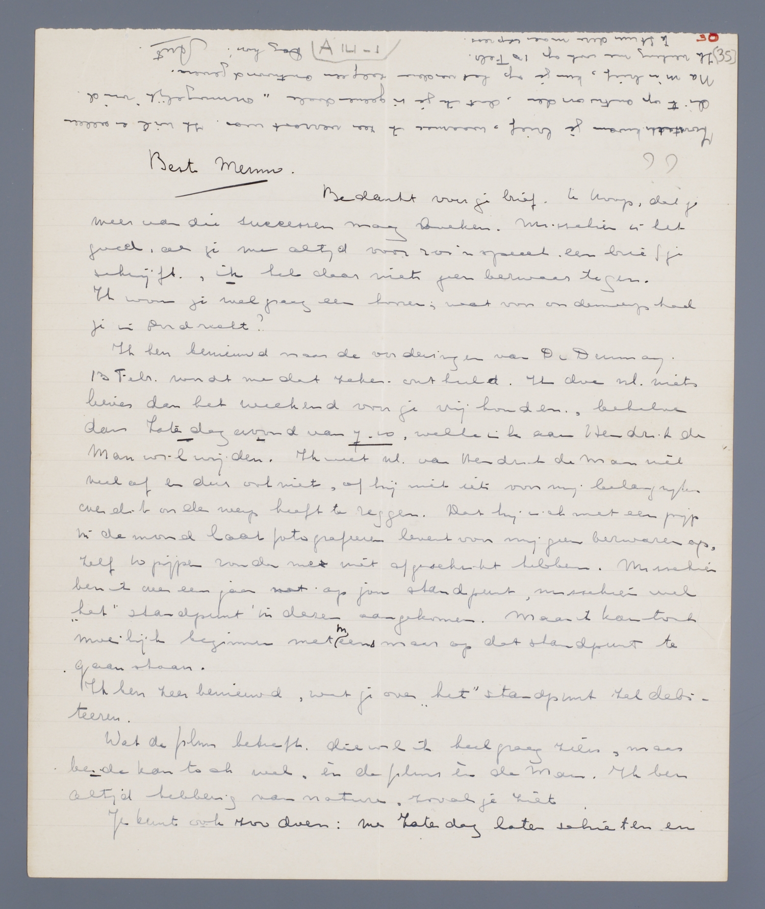 Je schrijft dus wel even wat je van plan bent te doen. Het is dus niet, dat ik de Man belangrijker vind dan Menno ter Braak; als ik alleen Zaterdag in A'dam zou zijn, liet ik hem in elk geval schieten, maar 't lijkt me nu voor jou zelfs wel rustig me eens een paar uur kwijt te zijn. Je ziet dus maar.
