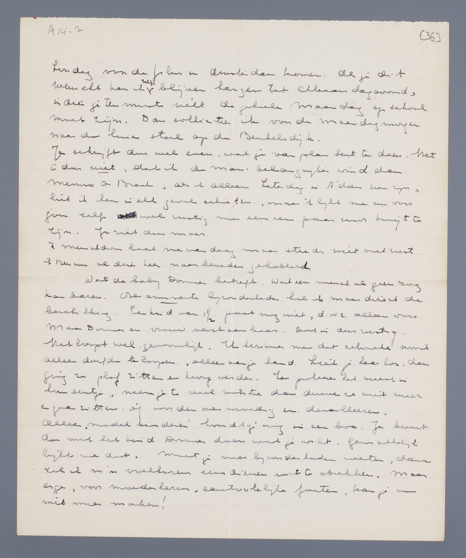 Wat de baby Donner betreft. Wat een mensch al geen zorg kan baren. Over amusante bijzonderheden heb ik maar direct de beschikking. Een kind van 1½ praat nog niet, d.w.z. alleen voor Max Donner en vrouw verstaanbaar. Dat is dus rustig. Het loopt wel, gewoonlijk. Ik herinner me dat Mineke nooit alleen durfde te loopen, alleen aan je hand. Liet je haar los, dan ging ze plof zitten en kroop verder. Ze probeeren het meest in hun eentje, neem je te veel notitie dan durven ze niet meer en gaan zitten, òf worden overmoedig en derailleeren. Alleen ‘model kinderen’ houdt je nog in een box. Je kunt dus met het kind Donner doen wat je wilt. Gemakkelijk lijkt me dat. Moet je meer bijzonderheden weten, dan zal ik m'n voelhorens eens dienen uit te strekken. Maar erge, voor moederlezers, aanstootelijke fouten, kan je nu niet meer maken!