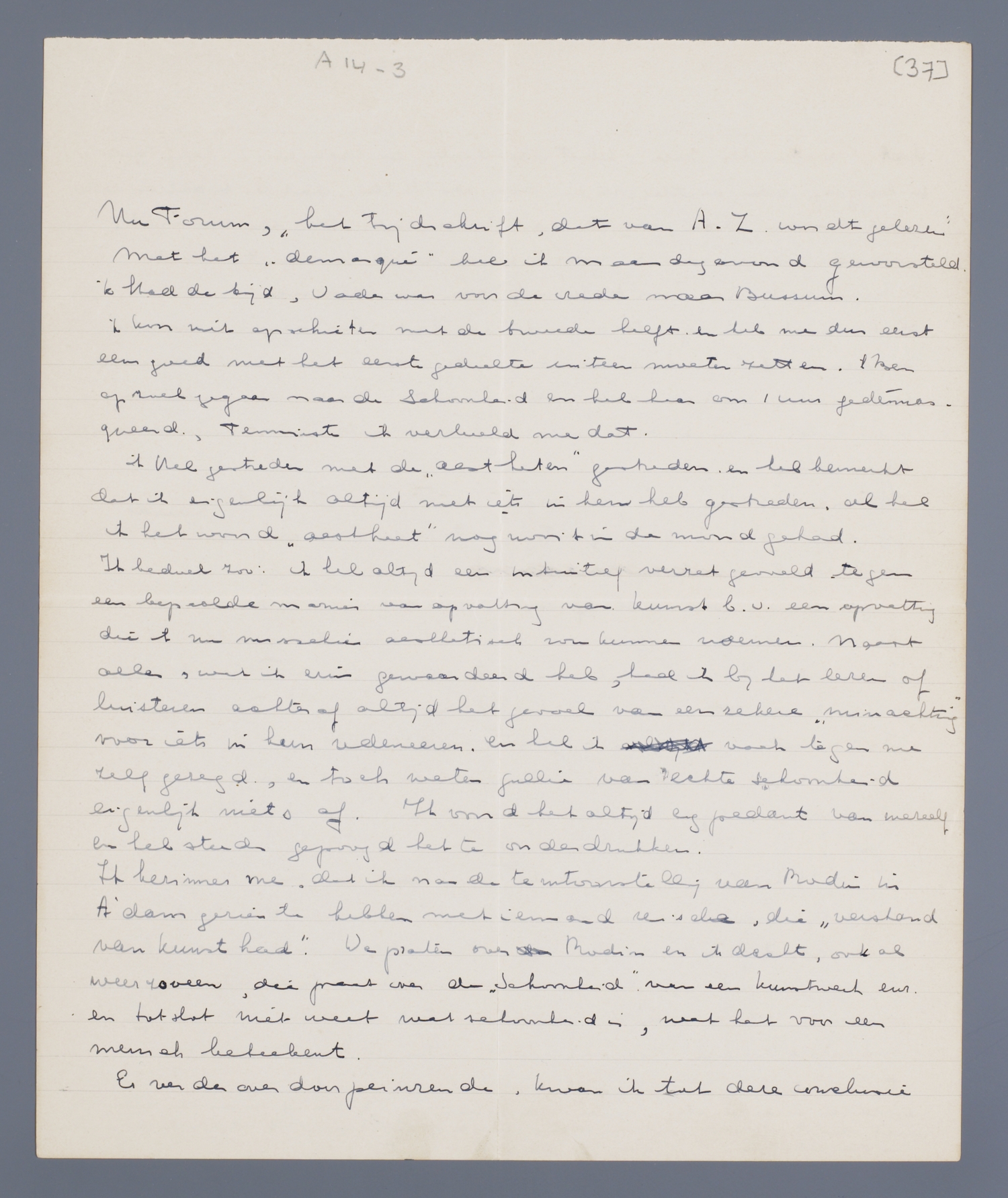 'k Heb met de ‘aestheten’ gestreden en heb bemerkt dat ik eigenlijk altijd met iets in hen heb gestreden, al heb ik het woord ‘aestheet’ nog nooit in de mond gehad. Ik bedoel zoo: ik heb altijd een intuïtief verzet gevoeld tegen een bepaalde manier van opvatting van kunst b.v. een opvatting die 'k nu misschien aesthetisch zou kunnen noemen. Naast alles, wat ik erin gewaardeerd heb, had ik bij het lezen of luisteren achteraf altijd het gevoel van een zekere ‘minachting’ voor iets in hun redeneeren, en heb vaak tegen me zelf gezegd, en toch weten jullie van echte schoonheid eigenlijk niets af. Ik vond het altijd erg pedant van mezelf en heb steeds gepoogd het te onderdrukken.
