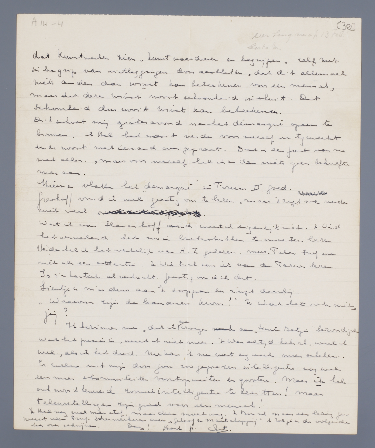 'k Heb nog wel meer stof, maar deze moet weg. 'k Ben nl. naar een lezing geweest van prof. Schermerhorn over ‘Geloof en maatschappij’. 'k Zal je er de volgende keer over schrijven.