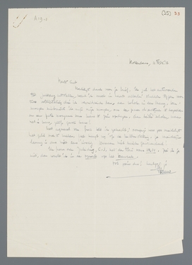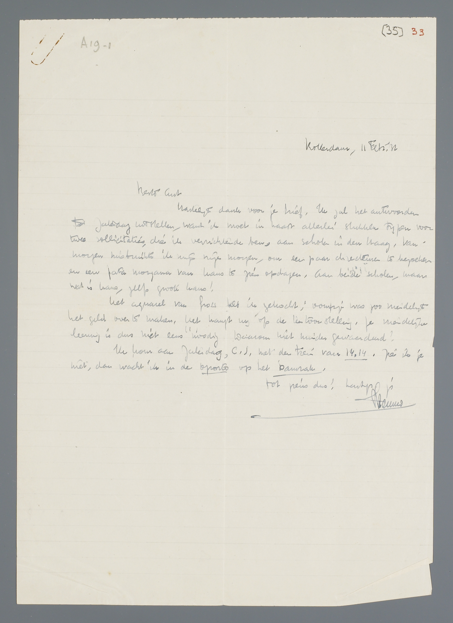 Hartelijk dank voor je brief. Ik zal het antwoorden tot Zaterdag uitstellen, want ik moet in haast allerlei stukken typen voor twee sollicitaties, die ik verrichtende ben, aan scholen in den Haag. Vanmorgen misbruikte ik mijn vrije morgen, om een paar directeuren te bezoeken en een fata morgana van kans te zien opdagen. Aan beide scholen, maar wat is kans, zelfs groote kans!