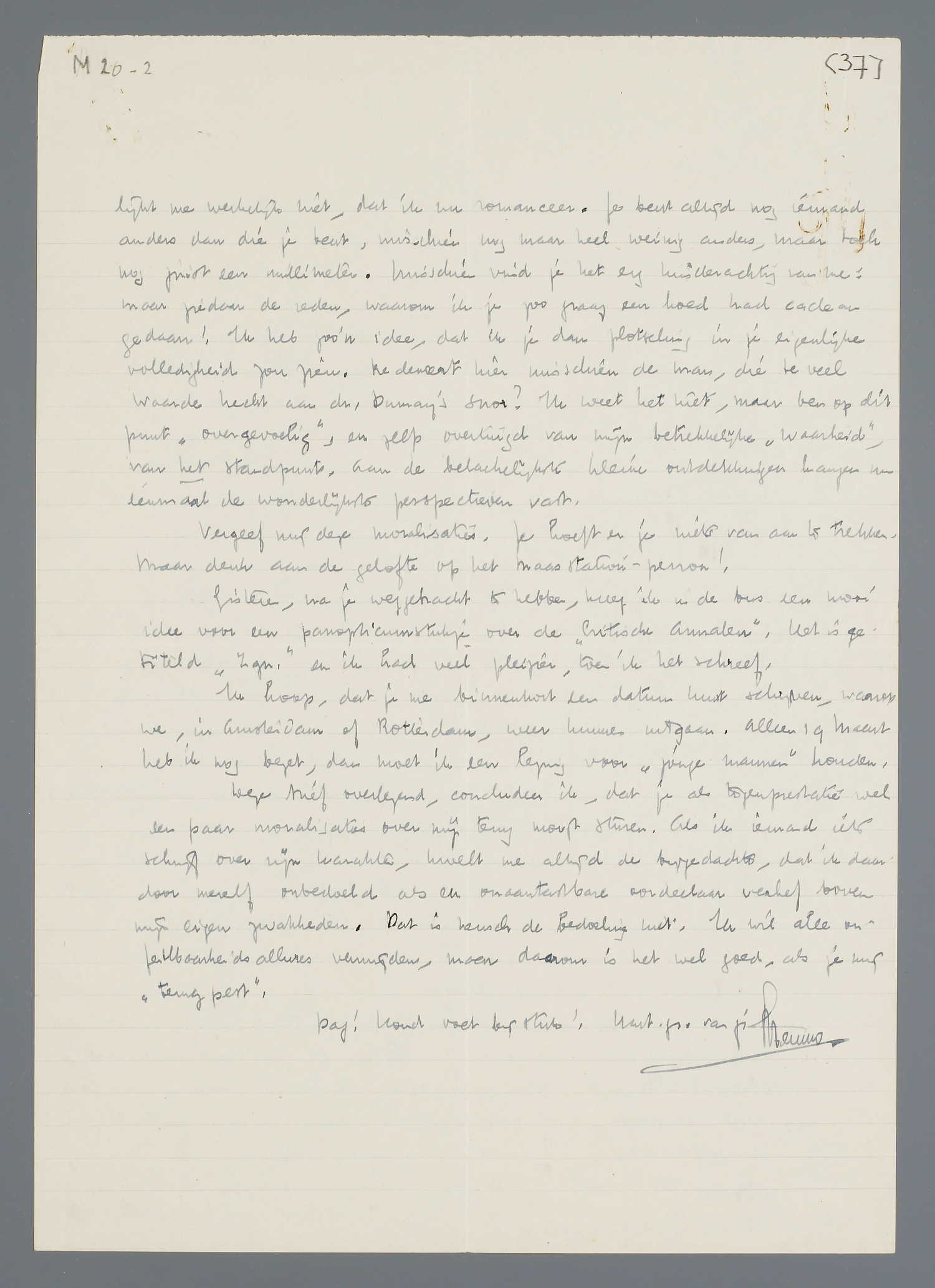 Deze brief overlezend, concludeer ik, dat je als tegenprestatie wel een paar moralisaties over mij terug moogt sturen. Als ik iemand iets schrijf over mijn karakter, kwelt me altijd de bijgedachte, dat ik daardoor mezelf onbedoeld als een onaantastbare oordeelaar verhef boven mijn eigen zwakheden. Dat is heusch de bedoeling niet. Ik wil alle onfeilbaarheidsallures vermijden, maar daarom is het wel goed, als je mij ‘terugpest’.