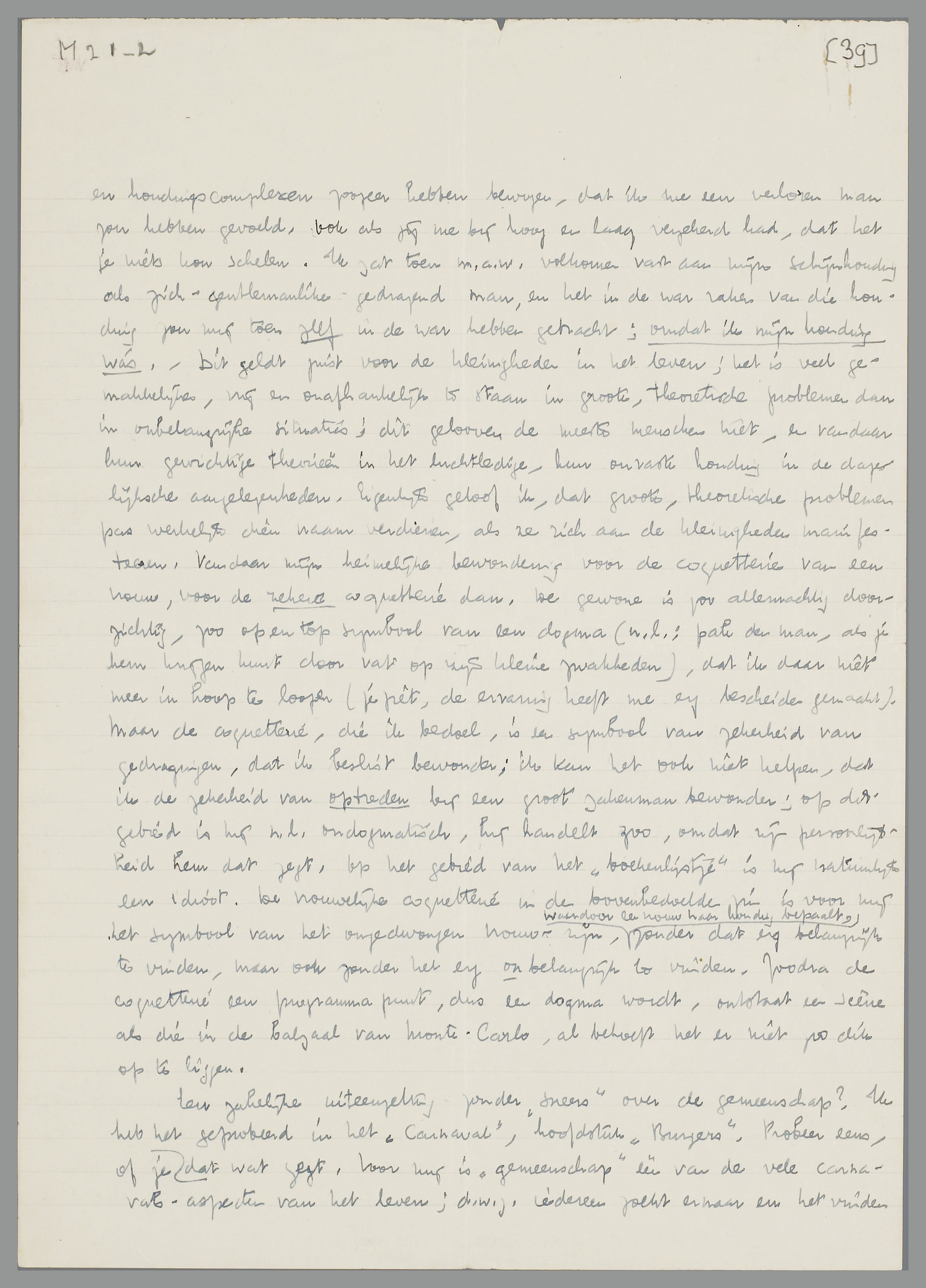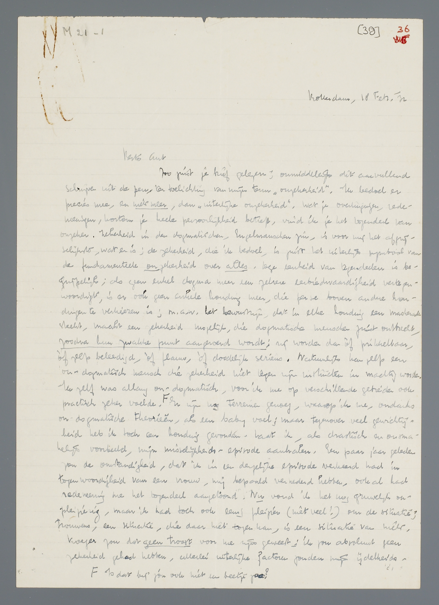 Zoo juist je brief gelezen; onmiddellijk dit aanvullend schrijven uit de pen, ter toelichting van mijn term ‘onzekerheid’. Ik bedoel er precies mee, en niet meer, dan ‘uiterlijke onzekerheid’. Wat je overtuigingen, redeneeringen, kortom je heele persoonlijkheid betreft, vind ik je het tegendeel van onzeker. Zekerheid in den dogmatischen, Engelmanschen zin, is voor mij het afgrijselijkste, wat er is; de zekerheid, die ik bedoel, is juist het uiterlijk symbool van de fundamenteele onzekerheid over alles. Deze eenheid van tegendeelen is begrijpelijk; als geen enkel dogma meer een zekere eerbiedwaardigheid vertegenwoordigt, is er ook geen enkele houding meer, die per se boven andere houdingen te verkiezen is; m.a.w. het bewustzijn, dat in elke houding een maskerade steekt, maakt een zekerheid mogelijk, die dogmatische menschen juist ontbreekt, zoodra hun zwakke punt aangeroerd wordt; zij worden dan òf prikkelbaar, òf zelfs beleedigd, òf flauw, òf doodelijk serieus. Natuurlijk kan zelfs een on-dogmatisch mensch die zekerheid niet tegen zijn instincten in machtig worden. Ik zelf was allang on-dogmatisch, voor ik me op verschillende gebieden ook practisch zeker voelde. <Is dat bij jou ook niet een beetje zoo?> Er zijn nog terreinen genoeg, waarop ik me, ondanks on-dogmatische theorieën, als een baby voel; maar tegenover veel gewichtigheid heb ik toch een houding gevonden. Laat ik, als drastisch en onsmakelijk voorbeeld, mijn misselijkheids-episode aanhalen. Een paar jaar geleden zou de omstandigheid, dat ik in een dergelijke episode verkeerd had in tegenwoordigheid van een vrouw, mij bepaald vernederd hebben, ook al had redeneering me het tegendeel aangetoond. Nu vond ik het nog gruwelijk onplezierig, maar ik had toch ook eenig pleizier (niet veel!) om de situatie; trouwens, een situatie, die daar niet tegen kan, is een situatie van niets. Vroeger zou dat geen troost voor me zijn geweest; ik zou absoluut geen zekerheid gehad hebben, allerlei uiterlijke factoren zouden mijn ijdelheids- en houdingscomplexen zoozeer hebben bewogen, dat ik me een verloren man zou hebben gevoeld. Ook als jij me bij hoog en laag verzekerd had, dat het je niets kon schelen. Ik zat toen m.a.w. volkomen vast aan mijn schijnhouding als zich-gentlemanlike-gedragend man, en het in de war raken van die houding zou mij toen zelf in de war hebben gebracht; omdat ik mijn houding wás. - Dit geldt juist voor de kleinigheden in het leven; het is veel gemakkelijker, vrij en onafhankelijk te staan in groote, theoretische problemen dan in onbelangrijke situaties; dit gelooven de meeste menschen niet, en vandaar hun gewichtige theorieën in het luchtledige, hun onvaste houding in de dagelijksche aangelegenheden. Eigenlijk geloof ik, dat groote, theoretische problemen pas werkelijk dien naam verdienen, als ze zich aan de kleinigheden manifesteeren. Vandaar mijn heimelijke bewondering voor de coquetterie van een vrouw, voor de zekere coquetterie dan. De gewone is zoo allemachtig doorzichtig, zoo op en top symbool van een dogma (n.l.: pak den man, als je hem krijgen kunt door vat op zijn kleine zwakheden), dat ik daar niet meer in hoop te loopen (je ziet, de ervaring heeft me erg bescheiden gemaakt). Maar de coquetterie, die ik bedoel, is een symbool van zekerheid van gedragingen, dat ik beslist bewonder; ik kan het ook niet helpen, dat ik de zekerheid van optreden bij een groot zakenman bewonder; op dit gebied is hij n.l. ondogmatisch, hij handelt zoo, omdat zijn persoonlijkheid hem dat zegt. Op het gebied van het ‘boekenlijstje’ is hij natuurlijk een idioot. De vrouwelijke coquetterie in den bovenbedoelden zin is voor mij het symbool van het ongedwongen vrouw-zijn, waardoor een vrouw haar houding bepaalt, zonder dat erg belangrijk te vinden, maar ook zonder het erg onbelangrijk te vinden. Zoodra de coquetterie een programma punt, dus een dogma wordt, ontstaat een scène als die in de balzaal van Monte-Carlo, al behoeft het er niet zoo dik op te liggen.