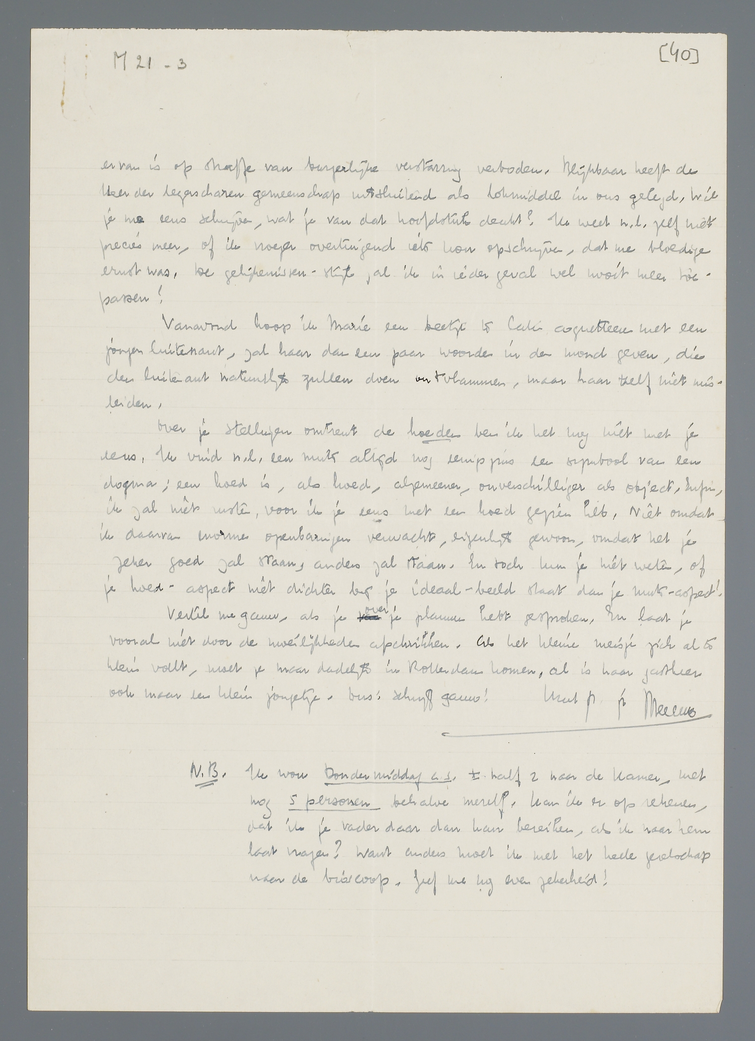 Over je stellingen omtrent de hoeden ben ik het nog niet met je eens. Ik vind n.l. een muts altijd nog eenigszins een symbool van een dogma; een hoed is, als hoed, algemeener, onverschilliger als object. Enfin, ik zal niet rusten, voor ik je eens met een hoed gezien heb. Niet omdat ik daarvan enorme openbaringen verwacht, eigenlijk gewoon, omdat het je zeker goed zal staan, anders zal staan. En toch kun je niet weten, of je hoed-aspect niet dichter bij je ideaal-beeld staat dan je muts-aspect!