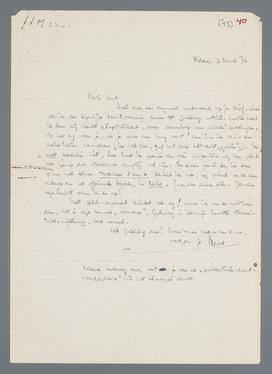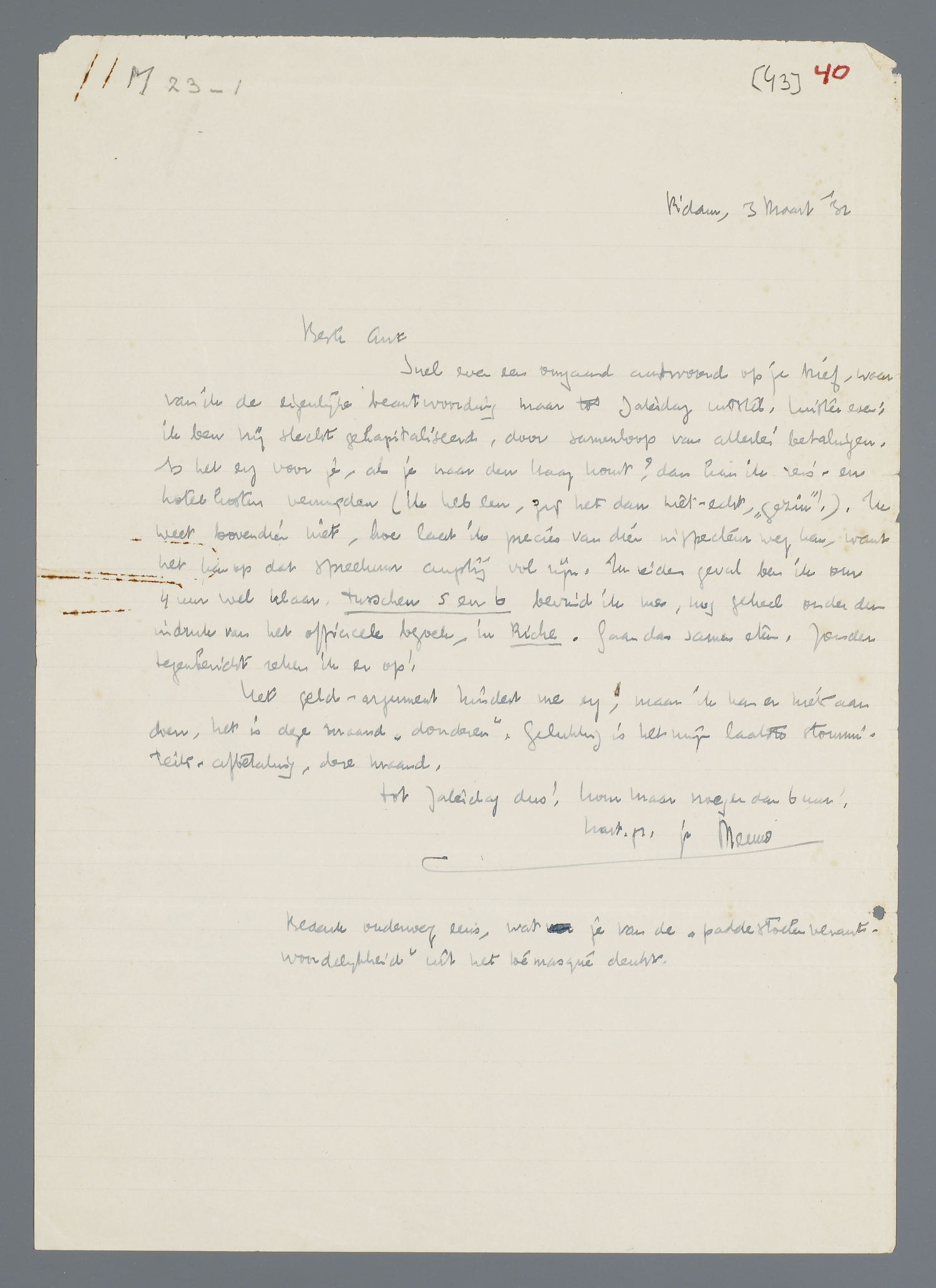 Snel even een omgaand antwoord op je brief, waarvan ik de eigenlijke beantwoording maar tot Zaterdag uitstel. Luister even: ik ben vrij slecht gekapitaliseerd, door samenloop van allerlei betalingen. Is het erg voor je, als je naar den Haag komt? dan kan ik reis- en hotelkosten vermijden (ik heb een, zij het dan niet-echt ‘gezin’!). Ik weet bovendien niet, hoe laat ik precies van dien inspecteur weg kan, want het kan op dat spreekuur angstig vol zijn. In ieder geval ben ik om 4 uur wel klaar, tusschen 5 en 6 bevind ik me, nog geheel onder den indruk van het officieele bezoek, in Riche. Gaan dan samen eten. Zonder tegenbericht reken ik er op!