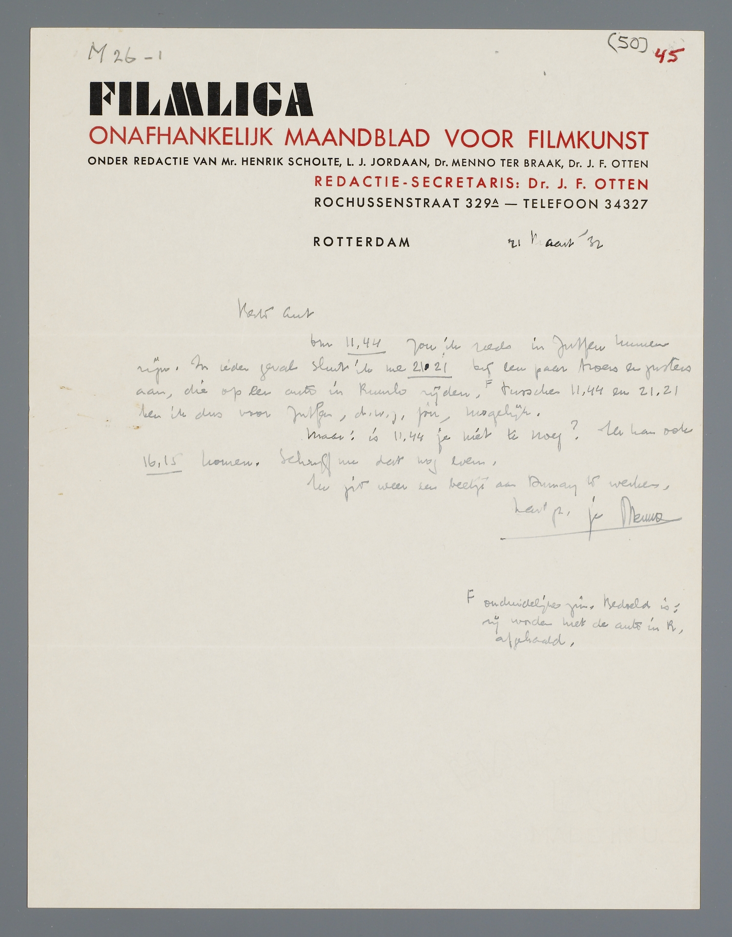 Om 11.44 zou ik reeds in Zutfen kunnen zijn. In ieder geval sluit ik me 21.21 bij een paar broers en zusters aan, die op een auto in Ruurlo rijden. <onduidelijke zin. Bedoeld is: zij worden met de auto in R. afgehaald.> Tusschen 11.44 en 21.21 ben ik dus voor Zutfen, d.w.z. jou, mogelijk. Maar: is 11.44 je niet te vroeg? Ik kan ook 16.15 komen. Schrijf me dat nog even. Ik zit weer een beetje aan Dumay te werken.
