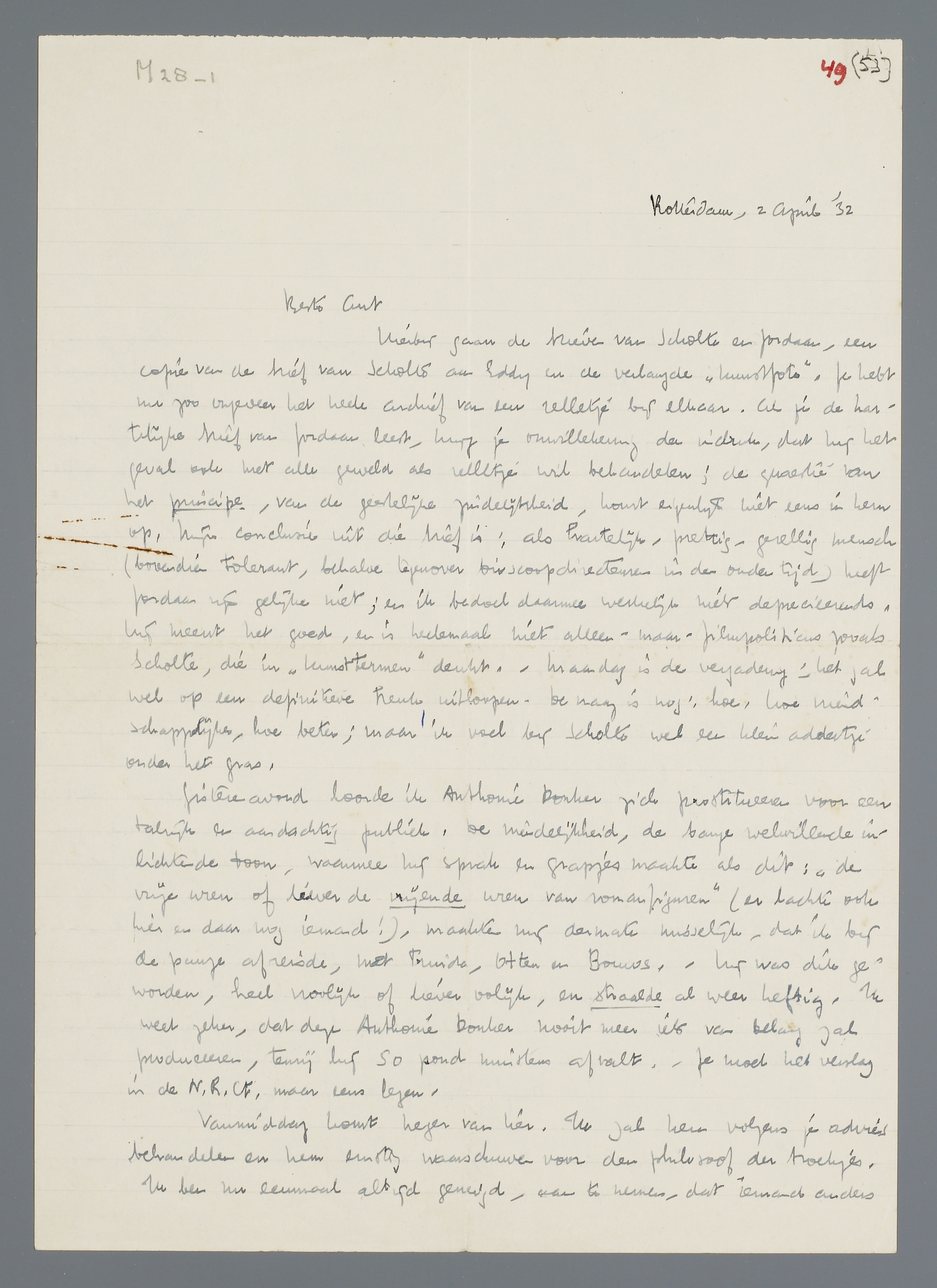 Hierbij gaan de brieven van Scholte en Jordaan, een copie van de brief van Scholte aan Eddy en de verlangde ‘kunstfoto’. Je hebt nu zoo ongeveer het heele archief van een relletje bij elkaar. Als je de hartelijke brief van Jordaan leest, krijg je onwillekeurig den indruk, dat hij het geval ook met alle geweld als relletje wil behandelen; de quaestie van het principe, van de geestelijke zindelijkheid, komt eigenlijk niet eens in hem op. Mijn conclusie uit die brief is: als hartelijk, prettig, gezellig mensch (bovendien tolerant, behalve tegenover bioscoopdirecteuren in den ouden tijd) heeft Jordaan zijn gelijke niet; en ik bedoel daarmee werkelijk niets deprecieerends. Hij meent het goed, en is heelemaal niet alleen-maar-filmpoliticus zooals Scholte, die in ‘kunsttermen’ denkt. - Maandag is de vergadering; het zal wel op een definitieve breuk uitloopen. De vraag is nog: hoe. Hoe vriendschappelijker, hoe beter; maar ik voel bij Scholte wel een klein addertje onder het gras.