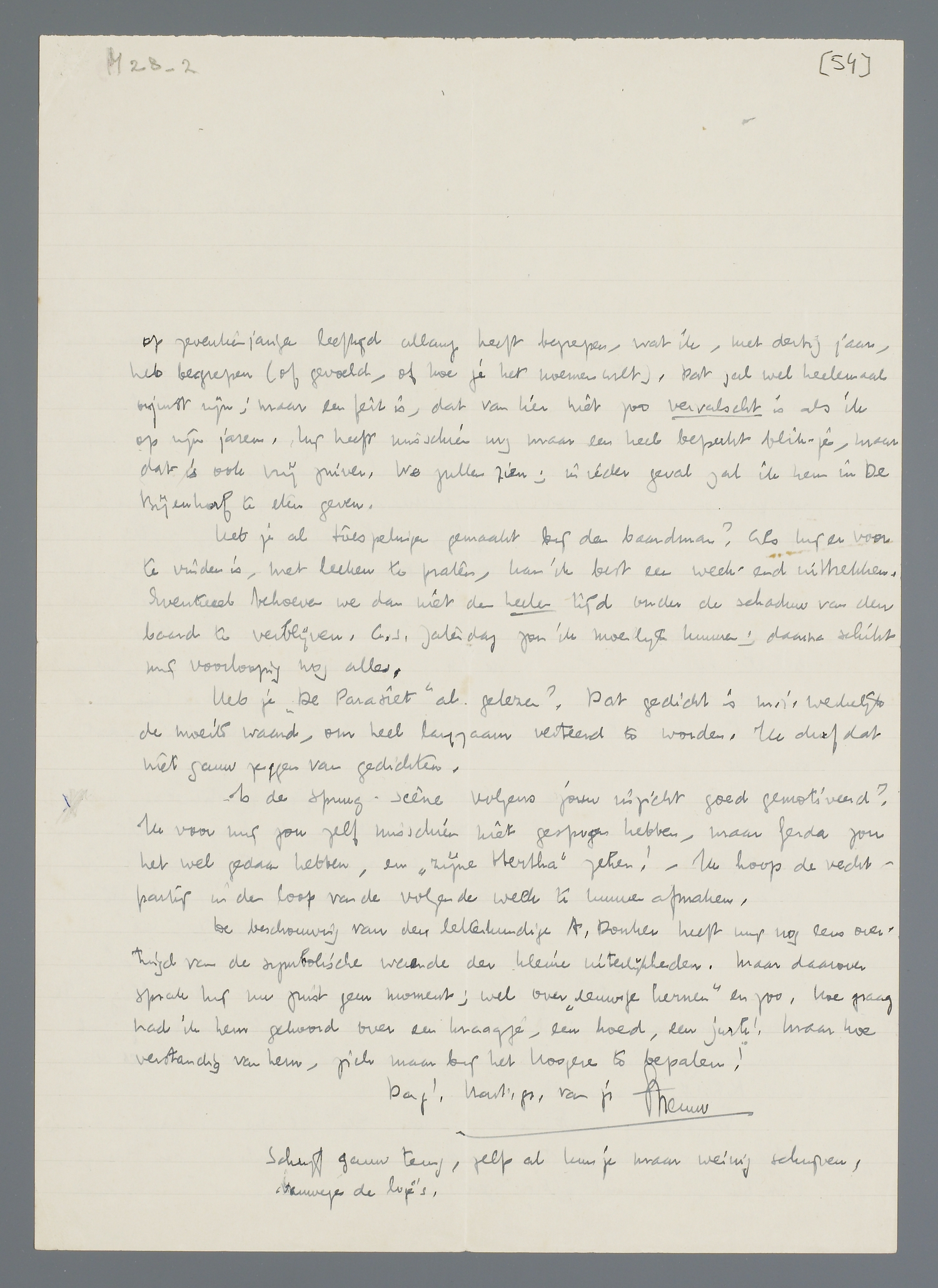 Is de spuug-scêne volgens jouw inzicht goed gemotiveerd? Ik voor mij zou zelf misschien niet gespogen hebben, maar Gerda zou het wel gedaan hebben, en ‘zijne Hertha’ zeker! - Ik hoop de vechtpartij in den loop van de volgende week te kunnen afmaken.