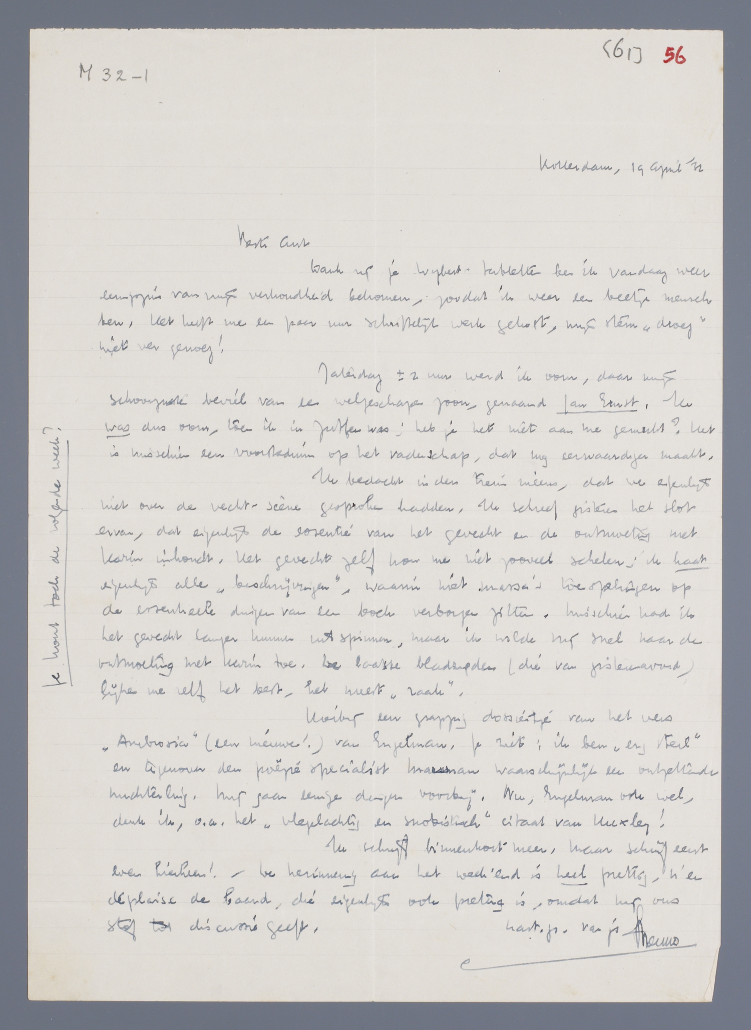 Hierbij een grappig dossiertje van het vers ‘Ambrosia’ (een nieuwe!) van Engelman. Je ziet: ik ben ‘erg steil’ en tegenover den poëzie specialist Marsman waarschijnlijk een ontzettende nuchterling. Mij gaan eenige dingen voorbij. Nu, Engelman ook wel, denk ik, o.a. het ‘vlegelachtig en snobistisch’ citaat van Huxley!