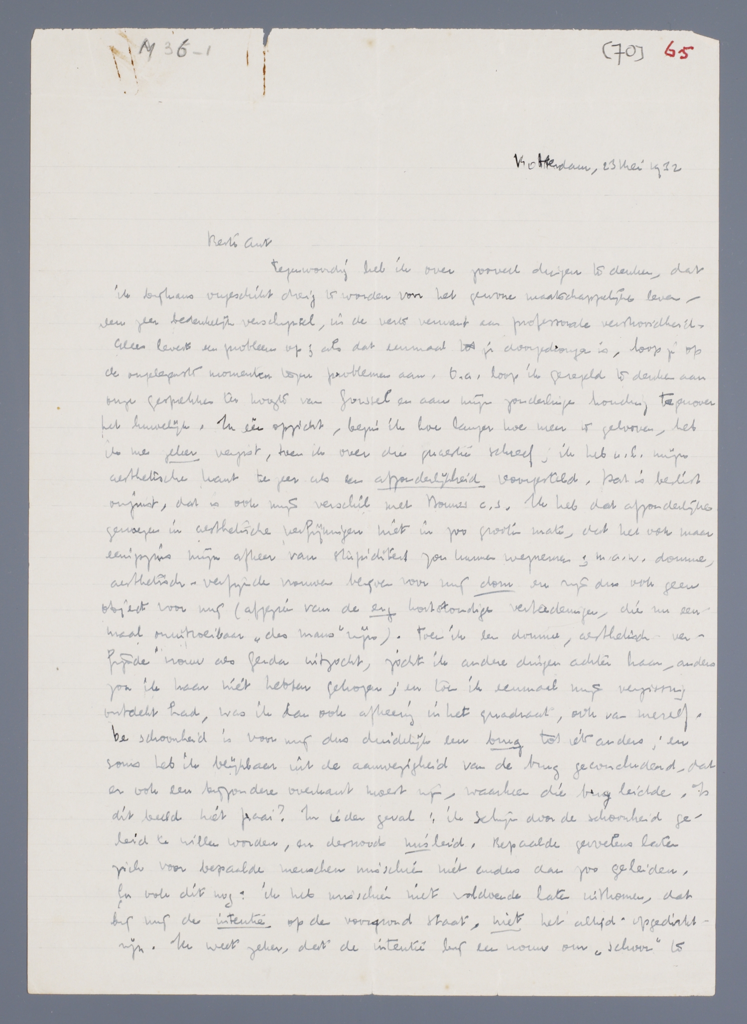 Tegenwoordig heb ik over zooveel dingen te denken, dat ik bijkans ongeschikt dreig te worden voor het gewone maatschappelijke leven - een zeer bedenkelijk verschijnsel, in de verte verwant aan professorale verstrooidheid. Alles levert een probleem op; als dat eenmaal tot je doorgedrongen is, loop je op de ongelegenste momenten tegen problemen aan. O.a. loop ik geregeld te denken aan onze gesprekken ter hoogte van Gorssel en aan mijn zonderlinge houding tegenover het huwelijk. In één opzicht, begin ik hoe langer hoe meer te gelooven, heb ik me zeker vergist, toen ik over de quaestie schreef; ik heb n.l. mijn aesthetische kant te zeer als een afzonderlijkheid voorgesteld. Dat is beslist onjuist, dat is ook mijn verschil met Bouws c.s. Ik heb dat afzonderlijke genoegen in aesthetische verfijningen niet in zoo grooten mate, dat het ook maar eenigszins mijn afkeer van stupiditeit zou kunnen wegnemen; m.a.w. domme, aesthetisch-verfijnde vrouwen blijven voor mij dom en zijn dus ook geen object voor mij (afgezien van de erg kortstondige verteederingen, die nu eenmaal onuitroeibaar ‘des mans’ zijn). Toen ik een domme, aesthetisch verfijnde vrouw als Gerda uitzocht, zocht ik andere dingen achter haar, anders zou ik haar niét hebben gekozen; en toen ik eenmaal mijn vergissing ontdekt had, was ik dan ook afkeerig in het quadraat, ook van mezelf. De schoonheid is voor mij dus duidelijk een brug tot iets anders; en soms heb ik blijkbaar uit de aanwezigheid van de brug geconcludeerd, dat er ook een bijzondere overkant moest zijn, waarheen die brug leidde. Is dit beeld niet fraai? In ieder geval: ik schijn door de schoonheid geleid te willen worden, en desnoods misleid. Bepaalde gevoelens laten zich voor bepaalde menschen misschien niet anders dan zoo geleiden. En ook dit nog: ik heb misschien niet voldoende laten uitkomen, dat bij mij de intentie op de voorgrond staat, niet het altijd opgedirkt zijn. Ik weet zeker, dat de intentie bij een vrouw om ‘schoon’ te willen zijn, iets anders en iets meer vertegenwoordigt, dan b.v. de intentie bij een man, om zich goed te kleeden. Wat, weet ik niet precies; misschien kun jij dat eens voor me uitmaken. Maar om nog een voorbeeld te geven: slordigheid en verslonzing bij een vrouw zijn beslist antipathieker dan bij een man, lijkt mij. Dit kan wel een mannelijk vooroordeel zijn, maar ik krijg de indruk, dat veel vrouwen het deelen. Wat op zichzelf niets over de intelligentie van het vooroordeel zegt, maar alleen iets over de geldigheid ervan. Waar zit dat in? Bij veel dieren is het toch precies andersom; de mannen zijn daar de prachtexemplaren met de dure japonnen en de ‘rijne Hertha's’ zijn er Bouws-grauw. Nogmaals: waar zit dat in?