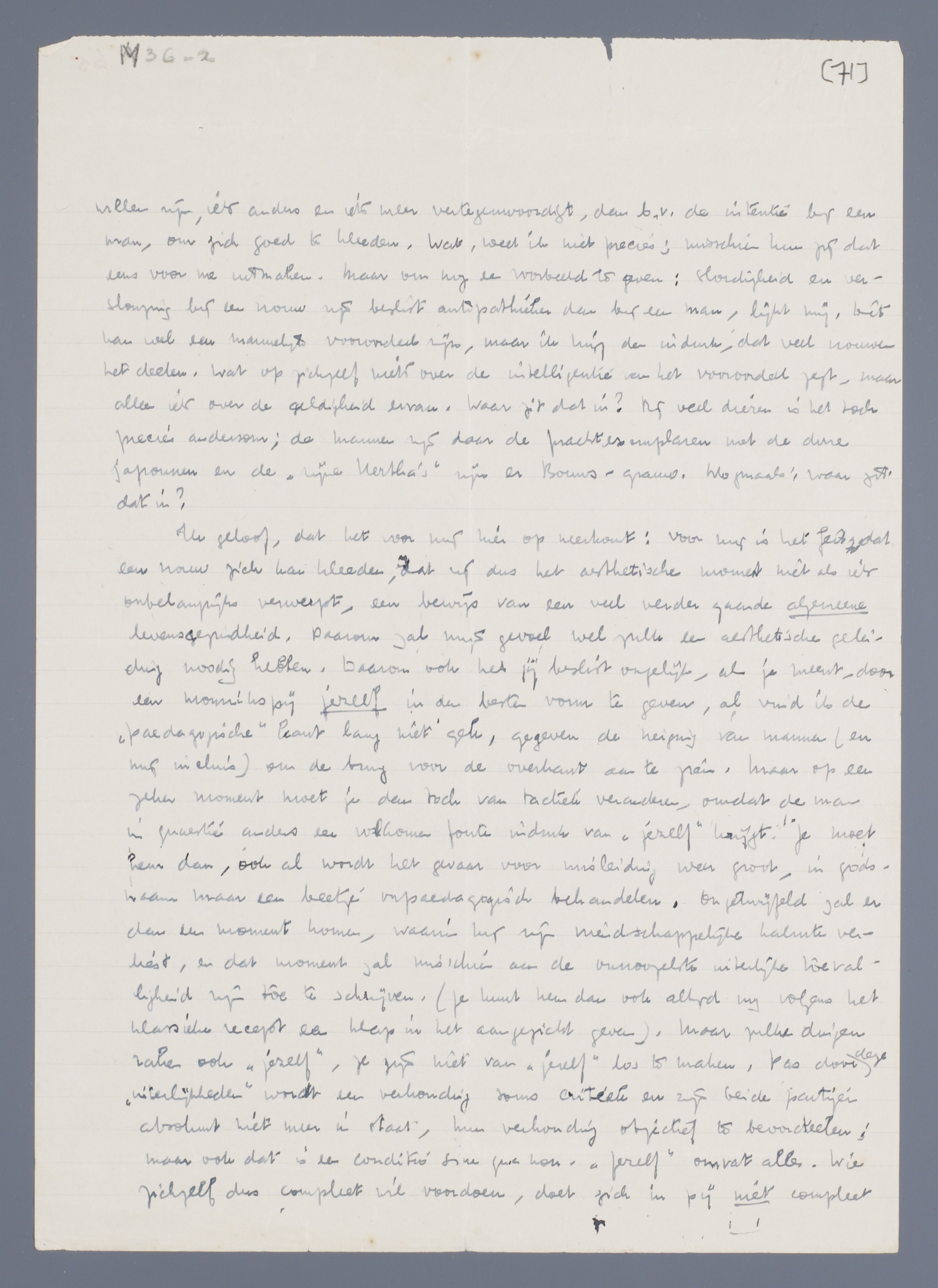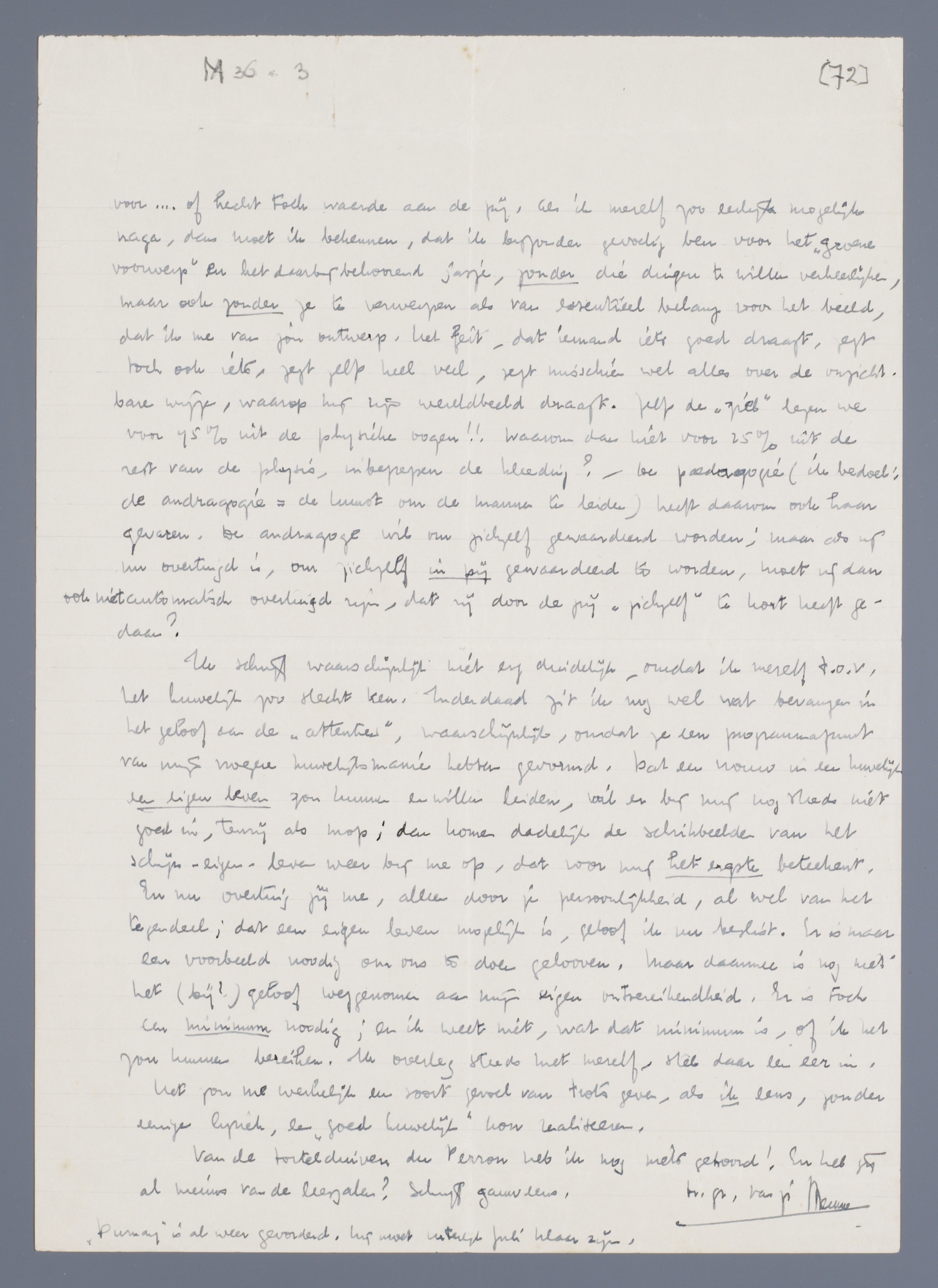 Ik geloof, dat het voor mij hier op neerkomt: voor mij is het feit, dat een vrouw zich kan kleeden, dat zij dus het aesthetische moment niet als iets onbelangrijks verwerpt, een bewijs van een veel verder gaande algemeene levensgezindheid. Daarom zal mijn gevoel wel zulk een aesthetische geleiding noodig hebben. Daarom ook heb jij beslist ongelijk, als je meent, door een monnikspij jezelf in den beste vorm te geven, al vind ik de ‘paedagogische’ kant lang niet gek, gegeven de neiging van mannen (en mij incluis) om de brug voor de overkant aan te zien. Maar op een zeker moment moet je dan toch van tactiek veranderen, omdat de man in quaestie anders een volkomen foute indruk van ‘jezelf’ krijgt. Je moet hem dan, ook al wordt het gevaar voor misleiding weer groot, in godsnaam maar een beetje onpaedagogisch behandelen. Ongetwijfeld zal er dan een moment komen, waarin hij zijn vriendschappelijke kalmte verliest, en dat moment zal misschien aan de onnoozelste uiterlijke toevalligheid zijn toe te schrijven. (Je kunt hem dan ook altijd nog volgens het klassieke recept een klap in het aangezicht geven). Maar zulke dingen raken ook ‘jezelf’, ze zijn niet van ‘jezelf’ los te maken. Pas door deze ‘uiterlijkheden’ wordt een verhouding soms critiek en zijn beide partijen absoluut niet meer in staat, hun verhouding objectief te beoordeelen; maar ook dat is een conditio sine qua non. ‘Jezelf’ omvat alles. Wie zichzelf dus compleet wil voordoen, doet zich in pij niet compleet voor... of hecht toch waarde aan de pij. Als ik mezelf zoo eerlijk mogelijk naga, dan moet ik bekennen, dat ik bijzonder gevoelig ben voor het ‘groene voorwerp’ en het daarbijbehoorend jasje, zonder die dingen te willen verheerlijken, maar ook zonder ze te verwerpen als van essentieel belang voor het beeld, dat ik me van jou ontwerp. Het feit, dat iemand iets goed draagt, zegt toch ook iets, zegt zelfs heel veel, zegt misschien wel alles over de onzichtbare wijze, waarop hij zijn wereldbeeld draagt. Zelfs de ‘ziel’ lezen we voor 45% uit de physieke oogen!! Waarom dan niet voor 25% uit de rest van de physis, inbegrepen de kleeding? - De paedagogie (ik bedoel: de andragogie = de kunst om de mannen te leiden) heeft daarom ook haar gevaren. De andragoge wil om zichzelf gewaardeerd worden; maar als zij nu overtuigd is, om zichzelf in pij gewaardeerd te worden, moet zij dan ook niet automatisch overtuigd zijn, dat zij door de pij ‘zichzelf’ te kort heeft gedaan?