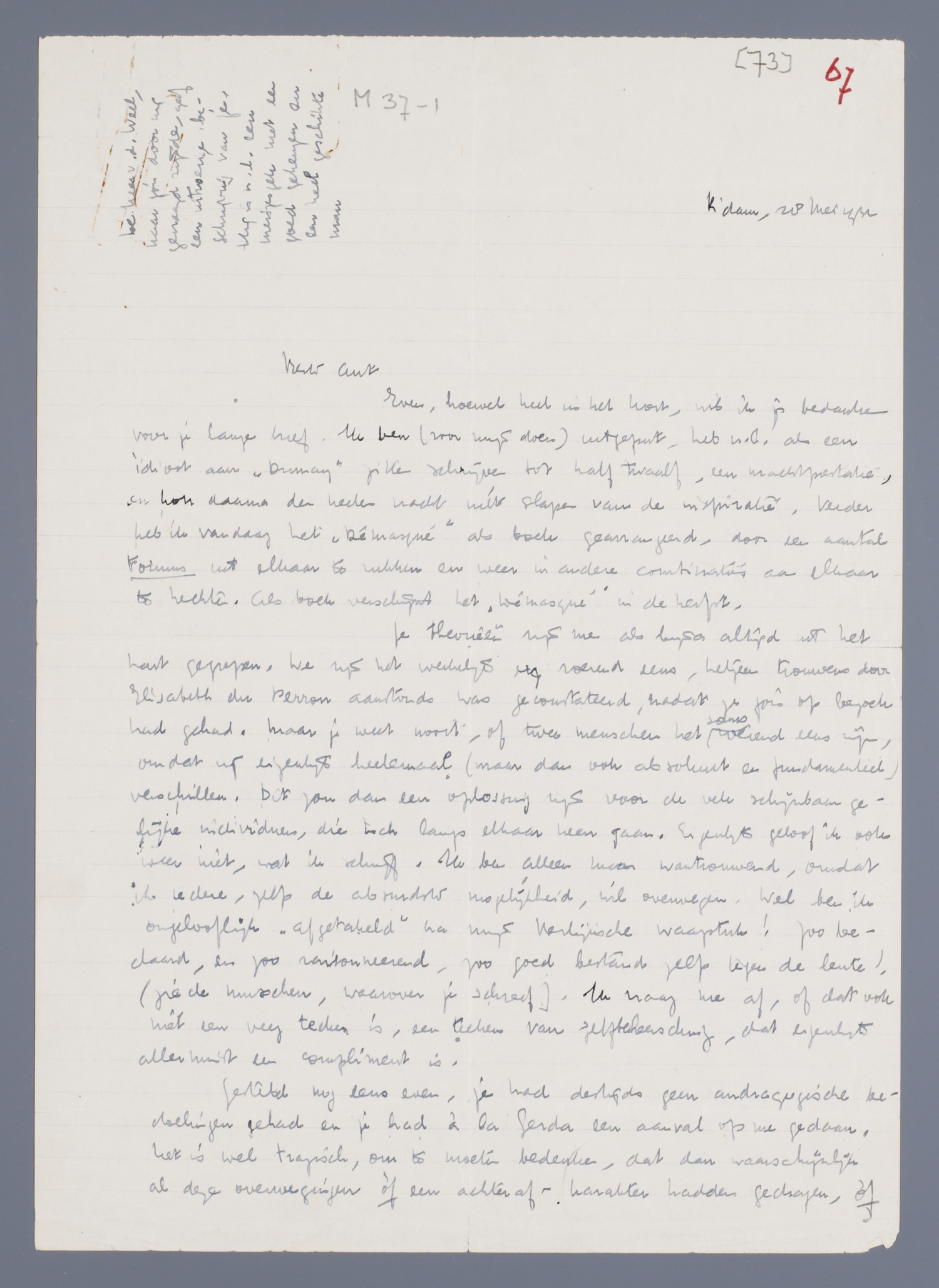 Even, hoewel in het kort, wil ik je bedanken voor je lange brief. Ik ben (voor mijn doen) uitgeput, heb n.l. als een idioot aan ‘Dumay’ zitten schrijven tot half twaalf, een krachtprestatie, en kon daarna den heelen nacht niet slapen van de inspiratie. Verder heb ik vandaag het ‘Démasqué’ als boek gearrangeerd, door een aantal Forums uit elkaar te rukken en weer in andere combinaties aan elkaar te hechten. Als boek verschijnt het ‘Démasqué’ in de herfst.