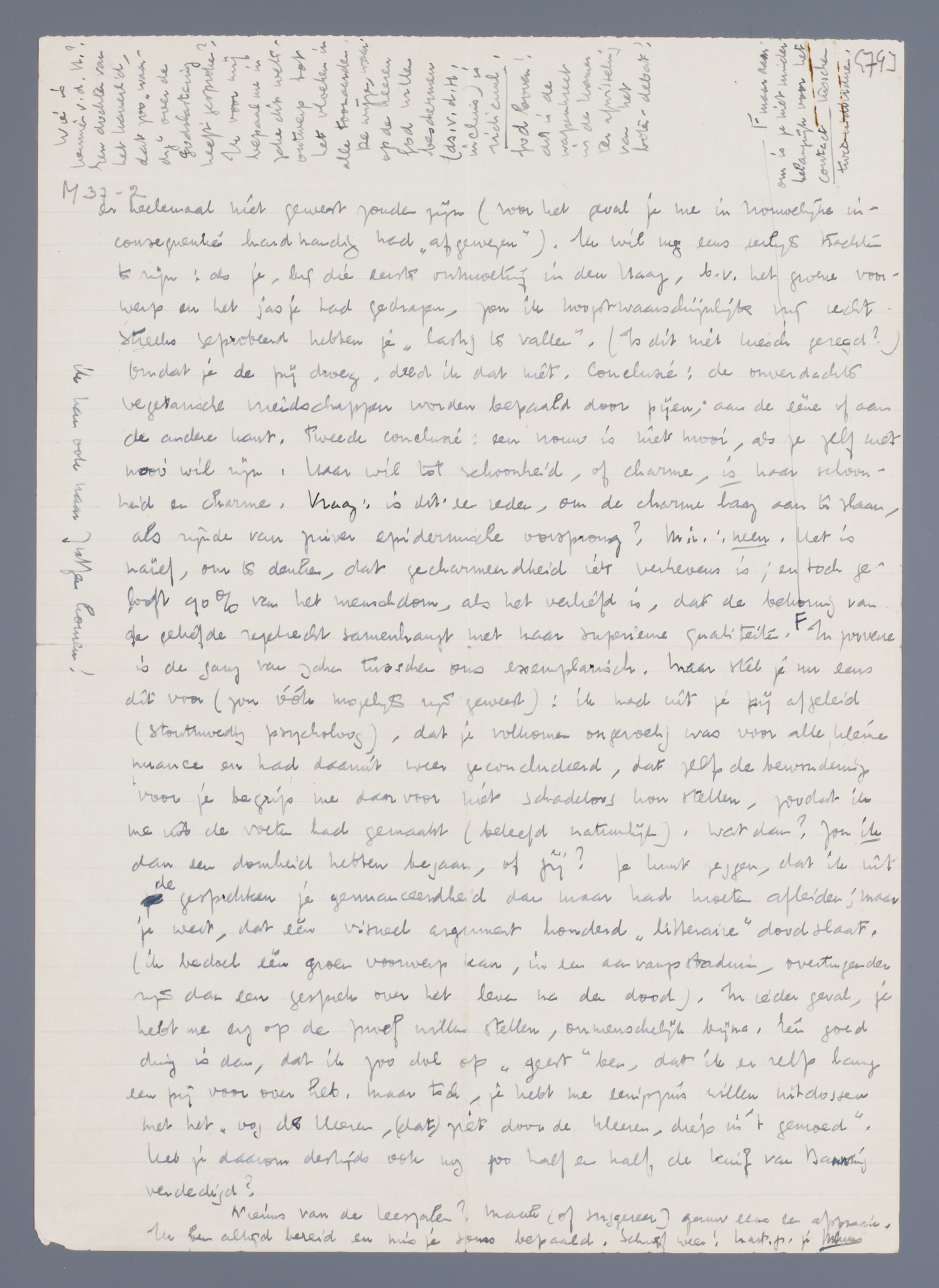 Gesteld nog eens even, je had destijds geen andragogische bedoelingen gehad en je had à la Gerda een aanval op me gedaan. Het is wel tragisch, om te moeten bedenken, dat dan waarschijnlijk al deze overwegingen òf een achteraf-karakter hadden gedragen, òf er heelemaal niet geweest zouden zijn (voor het geval je me in vrouwelijke inconsequentie hardhandig had ‘afgewezen’). Ik wil nog eens eerlijk trachten te zijn: als je, bij die eerste ontmoeting in den Haag, b.v. het groene voorwerp en het jasje had gedragen, zou ik hoogstwaarschijnlijk vrij rechtstreeks geprobeerd hebben je ‘lastig te vallen’. (Is dit niet kiesch gezegd?) Omdat je de pij droeg, deed ik dat niet. Conclusie: de onverdachte vegetarische vriendschappen worden bepaald door pijen; aan de ééne of aan de andere kant. Tweede conclusie: een vrouw is niet mooi, als je zelf niet mooi wil zijn. Haar wil tot schoonheid, of charme, is haar schoonheid en charme. Vraag: is dit een reden, om de charme laag aan te slaan, als zijnde van zuiver epidermische oorsprong? M.i.: neen. Het is naïef, om te denken, dat gecharmeerdheid iets verhevens is; en toch gelooft 90% van het menschdom, als het verliefd is, dat de bekoring van de geliefde regelrecht samenhangt met haar superieure qualiteiten. <Maar daarom is ze niet minder belangrijk voor het contact tusschen twee individuen.> In zooverre is de gang van zaken tusschen ons exemplarisch. Maar stel je nu eens dit voor (zou óók mogelijk zijn geweest): ik had uit je pij afgeleid (stoutmoedig psycholoog), dat je volkomen ongevoelig was voor alle kleine nuance en had daaruit weer geconcludeerd, dat zelfs de bewondering voor je begrip me daarvoor niet schadeloos kon stellen, zoodat ik me uit de voeten had gemaakt (beleefd natuurlijk). Wat dan? Zou ik dan een domheid hebben begaan, of jij? Je kunt zeggen, dat ik uit de gesprekken je genuanceerdheid dan maar had moeten afleiden; maar je weet, dat één visueel argument honderd ‘litteraire’ doodslaat. (ik bedoel één groen voorwerp kan, in een aanvangsstadium, overtuigender zijn dan een gesprek over het leven na den dood). In ieder geval, je hebt me erg op de proef willen stellen, onmenschelijk bijna. Eén goed ding is dan, dat ik zoo dol op ‘geest’ ben, dat ik er zelfs lang een pij voor over heb. Maar toch, je hebt me eenigszins willen uitdossen met het ‘oog des Heeren, (dat) ziet door de kleeren, diep in 't gemoed’. Heb je daarom destijds ook nog zoo half en half de kuif van Banning verdedigd?