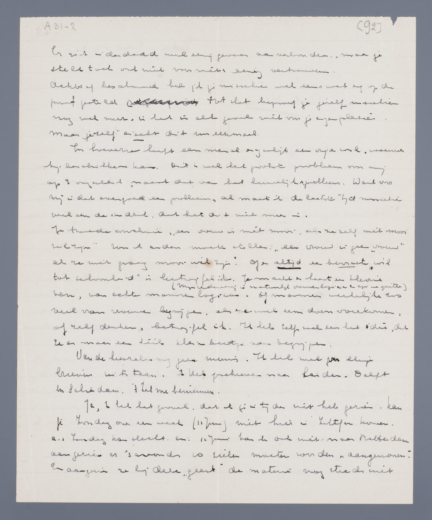 Maar ‘gesteld dit en dat’. Wat geeft het allemaal. Ik heb steeds het gevoel, dat je denkt, dat ik van mijn kant even goed op een andere manier te werk had kunnen gaan; dat ik deze z.g. paedagogie heb willen toepassen, je op de proef heb willen stellen enz. Terwijl ik het gevoel heb, niet anders te hebben kunnen doen dan juist zoo. Een mensch mòet toch voor zichzelf een zoo groot mogelijke zekerheid zien te verkrijgen en gaat in z'n middelen dan misschien wel eens wat te ver. Er zit inderdaad wel eenig gevaar aan verbonden, maar je stelt toch ook niet voor niets eenig vertrouwen. Achteraf beschouwd heb ik je misschien wel eens wat erg op de proef gesteld. Tot slot beproef je jezelf misschien nog wel meer, is het in elk geval niet voor je eigen plezier. Maar ‘jezelf’ eischt dit nu eenmaal.