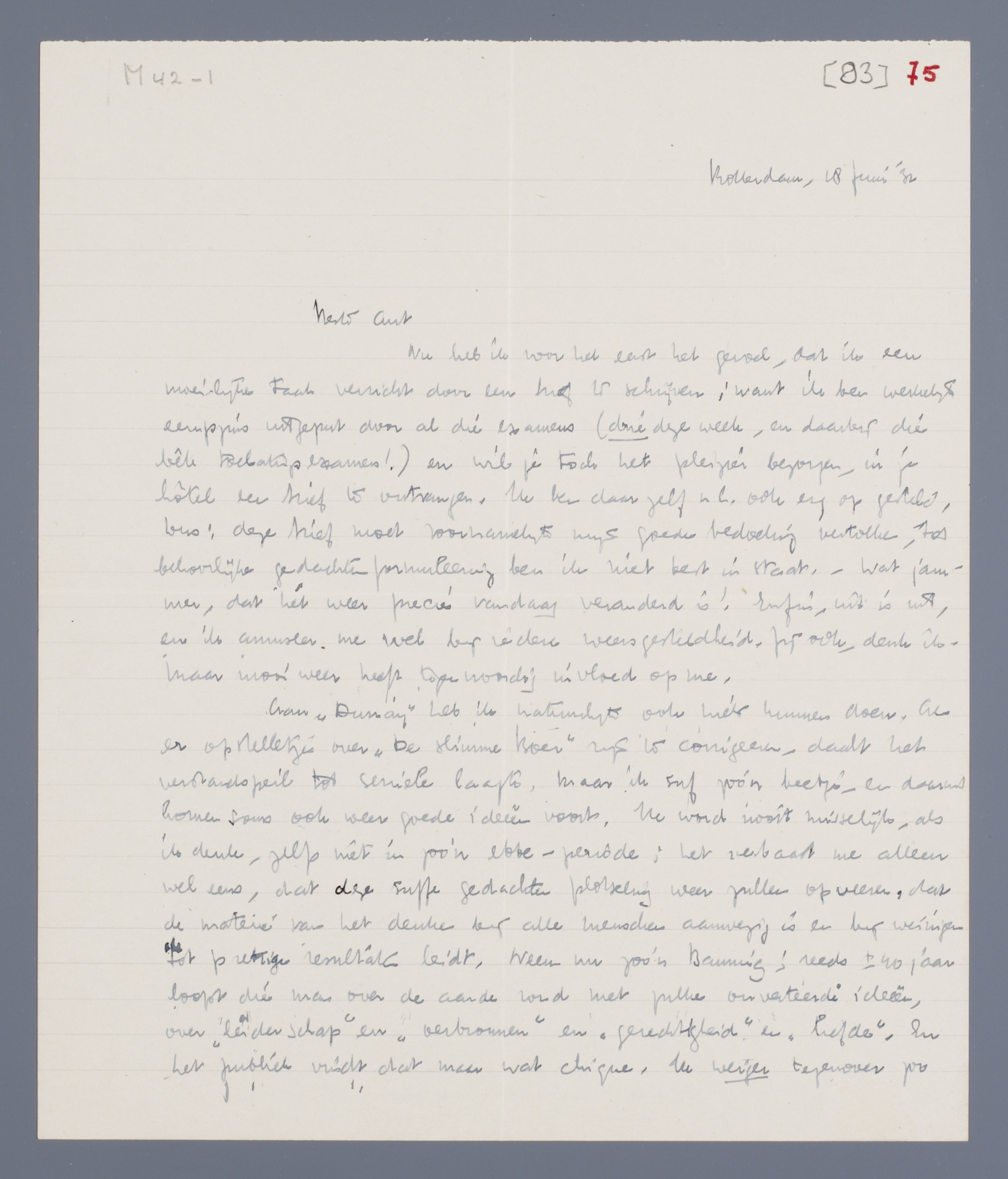 Nu heb ik voor het eerst het gevoel, dat ik een moeilijke taak verricht door een brief te schrijven; want ik ben werkelijk eenigszins uitgeput door al die examens (drie deze week, en daarbij die bête toelatingsexamens!) en wil je toch het pleizier bezorgen, in je hotel een brief te ontvangen. Ik ben daar zelf n.l. ook erg op gesteld. Dus: deze brief moet voornamelijk mijn goede bedoeling vertolken, tot behoorlijke gedachtenformuleering ben ik niet best in staat. - Wat jammer, dat het weer precies vandaag veranderd is! Enfin, uit is uit, en ik amuseer me wel bij ieder weersgesteldheid. Jij ook, denk ik. Maar mooi weer heeft tegenwoordig invloed op me.