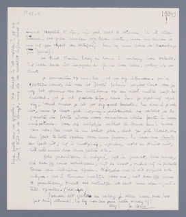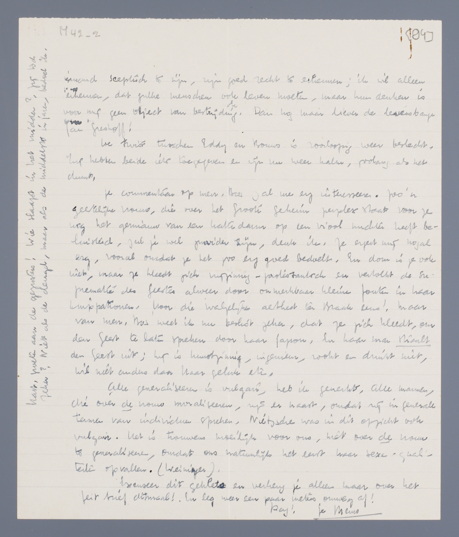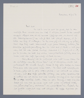 Je commentaar op mevr. Bos zal me erg interesseeren. Zoo'n geestelijke vrouw, die over het Groote Geheim perplex staat voor ze nog het gemiauw van een kattedarm op een viool nuchter heeft beluisterd, zal je wel [onleesbaar] zijn, denk ik. Ze ergert mij nogal erg, vooral omdat ze het zoo erg goed bedoelt. En dom is ze ook niet, maar ze kleedt zich vrijzinnig-protestantisch en vertolkt de suprematie des Geestes alweer door onmerkbaar kleine fouten in haar knippatronen. Hoor die walgelijke aestheet ter Braak eens! Maar van mevr. Bos weet ik nu beslist zeker, dat ze zich kleedt, om den Geest te laten spreken door haar japon. En haar man straalt den Geest uit; hij is kunstzinnig, ingenieur, rookt en drinkt niet, wil niet anders dan Haar geluk etc.
