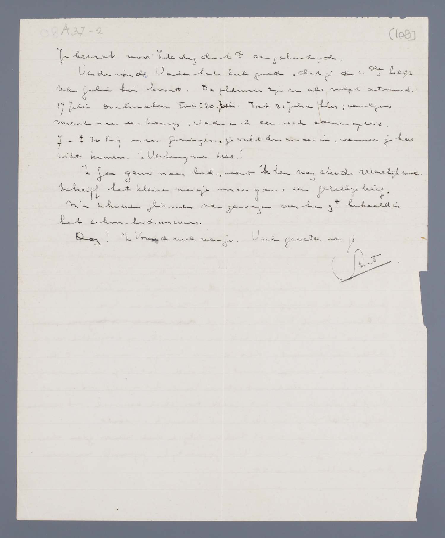 Verder vind Vader het heel goed, dat je de 2de helft van Juli hier komt. De plannen zijn nu als volgt ontvouwd: 17 Juli Doetinchem tot ± 20 Juli. Tot 31 Juli hier; vervolgens Mieneke naar een kamp. Vader en ik een week samen op reis. 7 - ± 20 Aug naar Groningen, je vult dus maar in, wanneer je hier wilt komen. 'k Verheug me zeer!