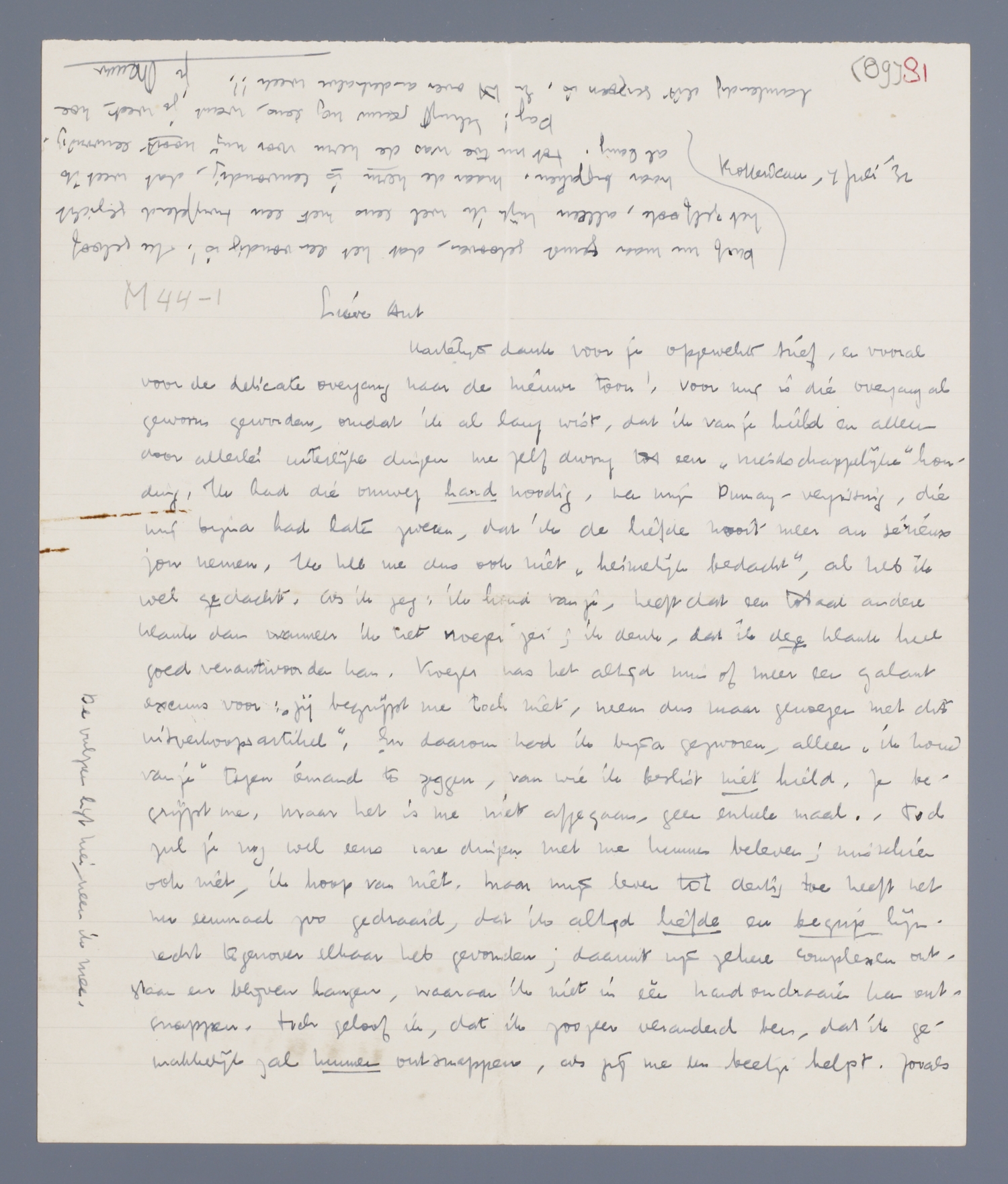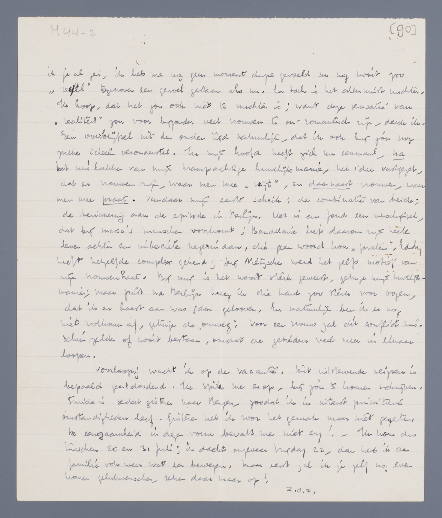 Hartelijk dank voor je opgewekte brief, en vooral voor de delicate overgang naar de nieuwe toon! Voor mij is die overgang al gewoon geworden, omdat ik al lang wist, dat ik van je hield en alleen door allerlei uiterlijke dingen me zelf dwong tot een ‘vriendschappelijke’ houding. Ik had die omweg hard noodig. Na mijn Dumay-vergissing, die mij bijna had laten zweren, dat ik de liefde nooit meer au sériéux zou nemen. Ik heb me dus ook niet ‘heimelijk bedacht’, al heb ik wel gedacht. Als ik zeg: ik houd van je, heeft dat een totaal andere klank dan wanneer ik het vroeger zei; ik denk, dat ik deze klank heel goed verantwoorden kan. Vroeger was het altijd min of meer een galant excuus voor: ‘jij begrijpt me toch niet, neem dus maar genoegen met dit uitverkoopsartikel’. En daarom had ik bijna gezworen, alleen ‘ik houd van je’ tegen iemand te zeggen, van wie ik beslist niet hield. Je begrijpt me. Maar het is me niet afgegaan, geen enkele maal. - Toch zou je nog wel eens rare dingen met me kunnen beleven; misschien ook niet, ik hoop van niet. Maar mijn leven tot dertig toe heeft het nu eenmaal zoo gedraaid, dat ik altijd liefde en begrip lijnrecht tegenover elkaar heb gevonden; daaruit zijn zekere complexen ontstaan en blijven hangen, waaraan ik niet in één handomdraai kan ontsnappen. Toch geloof ik, dat ik zoozeer veranderd ben, dat ik gemakkelijk zal kunnen ontsnappen, als jij me een beetje helpt. Zooals ik je al zei, ik heb me nog geen moment dupe gevoeld en nog nooit zoo ‘reëel’ tegenover een gevoel gestaan als nu. En toch is het allerminst nuchter. Ik hoop, dat het jou ook niet te nuchter is; want deze sensatie van ‘realiteit’ zou voor bijzonder veel vrouwen te on-romantisch zijn, denk ik. Een overblijfsel uit den ouden tijd natuurlijk, dat ik ook bij jou nog zulke ideeën veronderstel. In mijn hoofd heeft zich nu eenmaal, na het mislukken van mijn krampachtige huwelijksmanie, het idee vastgezet, dat er vrouwen zijn, waar men mee ‘vrijt’, en daarnaast vrouwen, waar men mee praat. Vandaar mijn eerste schrik: de combinatie van beide; de herinnering aan de episode in Berlijn. Het is au fond een verschijnsel, dat bij massa's menschen voorkomt; Baudelaire liep daarom zijn heele leven achter een imbeciele negerin aan, die geen woord kon ‘praten’. Eddy heeft hetzelfde complex gekend; bij Nietzsche werd het zelfs motief van zijn vrouwenhaat. Bij mij is het nooit sterk geweest, getuige mijn huwelijksmanie, maar juist na Berlijn kreeg ik die kant zoo sterk voor oogen, dat ik er haast aan was gaan gelooven. En natuurlijk ben ik er nog niet volkomen af, getuige de ‘omweg’. Voor een vrouw zal dit conflict misschien zelden of nooit bestaan, omdat de gebieden veel meer in elkaar loopen.