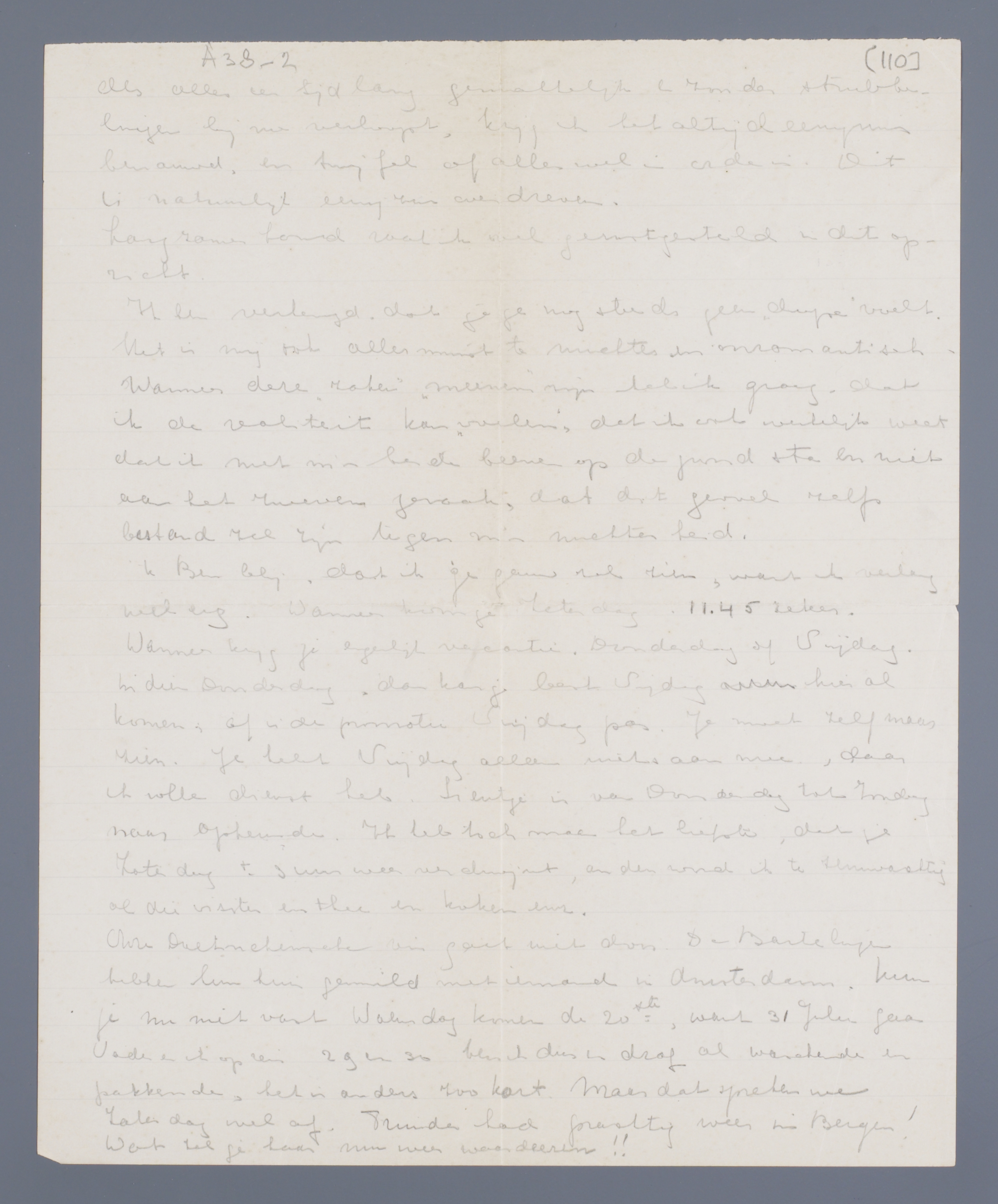'k Ben blij, dat ik je gauw zal zien, want ik verlang wel erg. Wanneer kom je Zaterdag, 11.45 zeker.