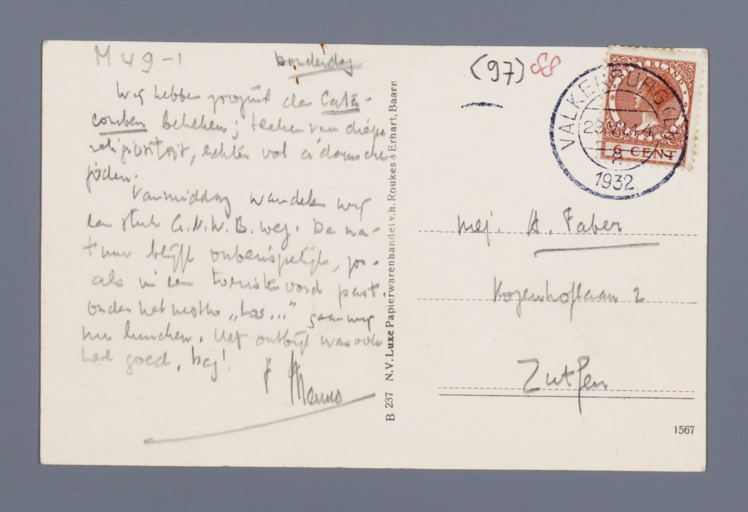 Vanmiddag wandelen wij een stuk A.N.W.B. weg. De natuur blijft onberispelijk, zooals in een toeristenoord past. Onder het motto ‘los...’ gaan wij nu lunchen. Het ontbijt was ook heel goed.