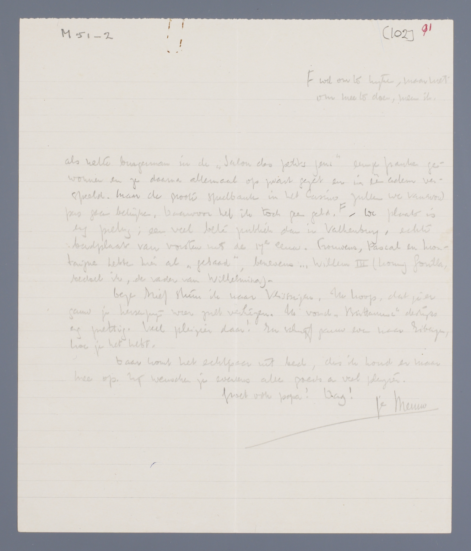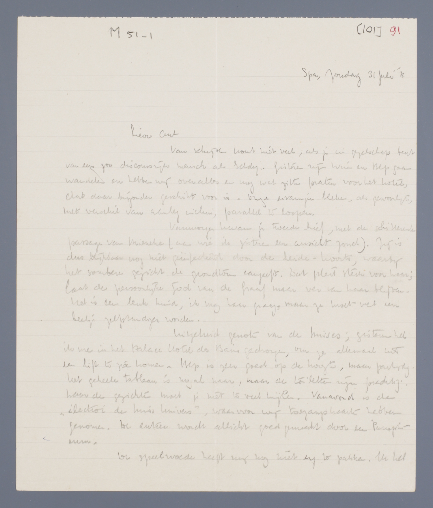 De speelwoede heeft mij nog niet erg te pakken. Ik heb als nette burgerman in de ‘Salon des petits gens’ eenige franken gewonnen en ze daarna allemaal op zwart gezet en in één adem verspeeld. Maar de groote speelbank in het Casino zullen we vanavond pas gaan bekijken. Daarvoor heb ik toch geen geld <wel om te kijken, maar niet om mee te doen, meen ik>. - De plaats is erg prettig; een veel beter publiek dan in Valkenburg, echte badplaats van vorsten uit de 17e eeuw. Trouwens, Pascal en Montaigne hebben hier al ‘gebaad’, benevens... Willem III (koning Gorilla bedoel ik, de vader van Wilhelmina).