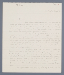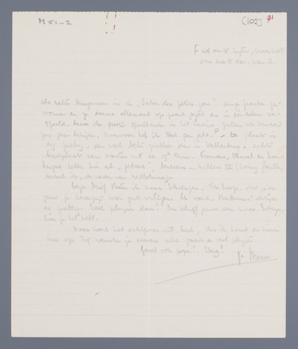 Vanmorgen kwam je tweede brief, met de schitterende passage van Mieneke (aan wie ik gisteren een ansicht zond). Zij is dus blijkbaar nog niet geïnfecteerd door de heide-koorts, waarbij het sombere gezicht de grondtoon aangeeft. Dat pleit sterk voor haar; laat de persoonlijke God van de Graaf maar ver van haar blijven. Het is een leuk kind, ik mag haar graag, maar ze moet wel een beetje zelfstandiger worden.