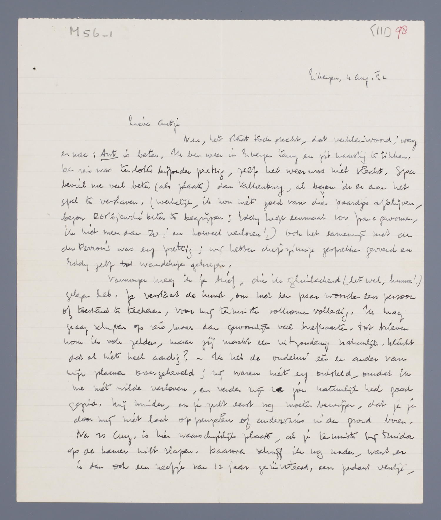 Nee, het staat toch slecht, dat verkleinwoord; weg er mee: Ant is beter. Ik ben weer in Eibergen terug en zit naarstig te tikken. De reis was tenslotte bijzonder prettig, zelfs het weer was niet slecht. Spa beviel me veel beter (als plaats) dan Valkenburg, al begon ik er aan het spel te verslaven. (Werkelijk, ik kon niet goed van die paardjes afblijven, begon Dostojewski beter te begrijpen; Eddy heeft eenmaal 100 franc gwonnen, ik niet meer dan 20; en hoeveel verloren!) Ook het samenzijn met de du Perron's was erg prettig; wij hebben diepzinnige gesprekken gevoerd en Eddy zelfs tot wandelingen gekregen.