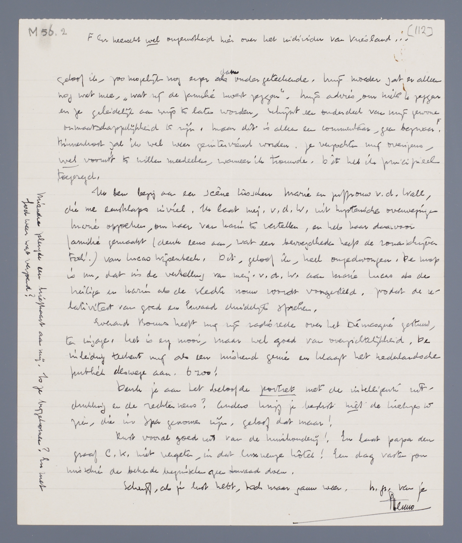 Na 20 Aug. is hier waarschijnlijk plaats, als je tenminste bij Truida op de kamer wilt slapen. Daarover schrijf ik nog nader, want er is dan ook een neefje van 12 jaar geïnterneerd, een pedant ventje, geloof ik, zoo mogelijk nog erger dan ondergeteekende. Mijn moeder zat er alleen nog wat mee, ‘wat zij de familie moest zeggen’. Mijn advies, om niets te zeggen en ze geleidelijk aan wijs te laten worden, schijnt een onderdeel van mijn gewone onmaatschappelijkheid te zijn. Maar dit is alleen een commentaar, geen bezwaar. <Er heerscht wel ongerustheid hier over het individu van Vriesland...>