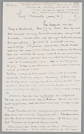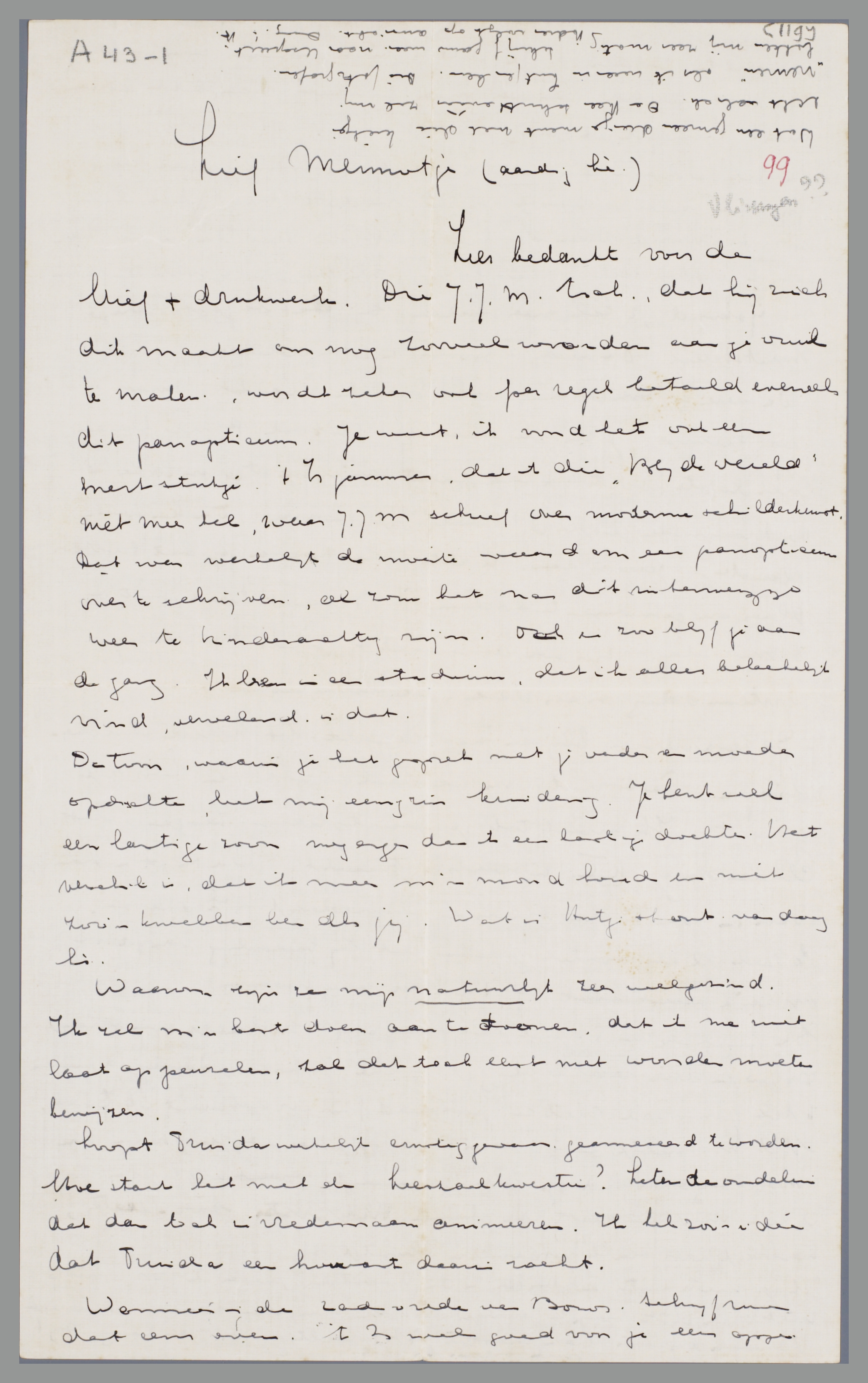 Zeer bedankt voor de brief + drukwerk. Die J.J.M. toch, dat hij zich dik maakt om nog zooveel woorden aan je vuil te maken, wordt zeker ook per regel betaald evenals dit panopticum. Je weet, ik vond het ook een snertstukje. ‘t Is jammer, dat ik die ‘Blijde wereld’ niet meer heb, waar J.J.M. schreef over moderne schilderkunst. Dat was werkelijk de moeite waard om een panopticum over te schrijven, al zou het na dit intermezzo weer te kinderachtig zijn. En zoo blijf je aan de gang. Ik ben in een stadium, dat ik alles belachelijk vind, vervelend is dat.