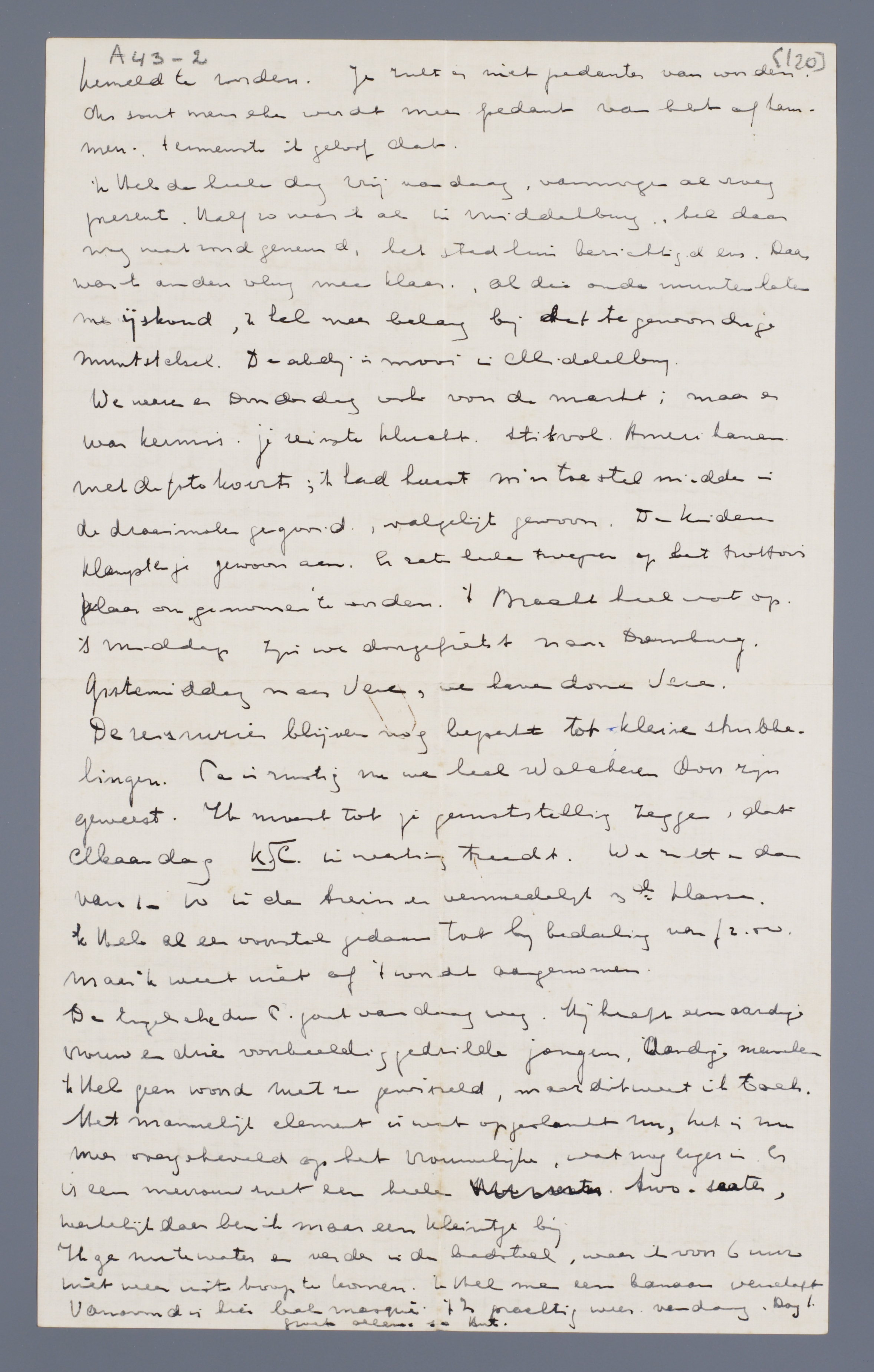 De reisruzies blijven nog beperkt tot kleine strubbelingen. Pa is rustig nu we heel Walcheren door zijn geweest. Ik moest tot je geruststelling zeggen, dat Maandag C.K. in werking treedt. We zitten dan van 1-10 in de trein en vermoedelijk 3de klasse. 'k Heb al een voorstel gedaan tot bijbetaling van f 2,50 maar ik weet niet of ‘t wordt aangenomen.