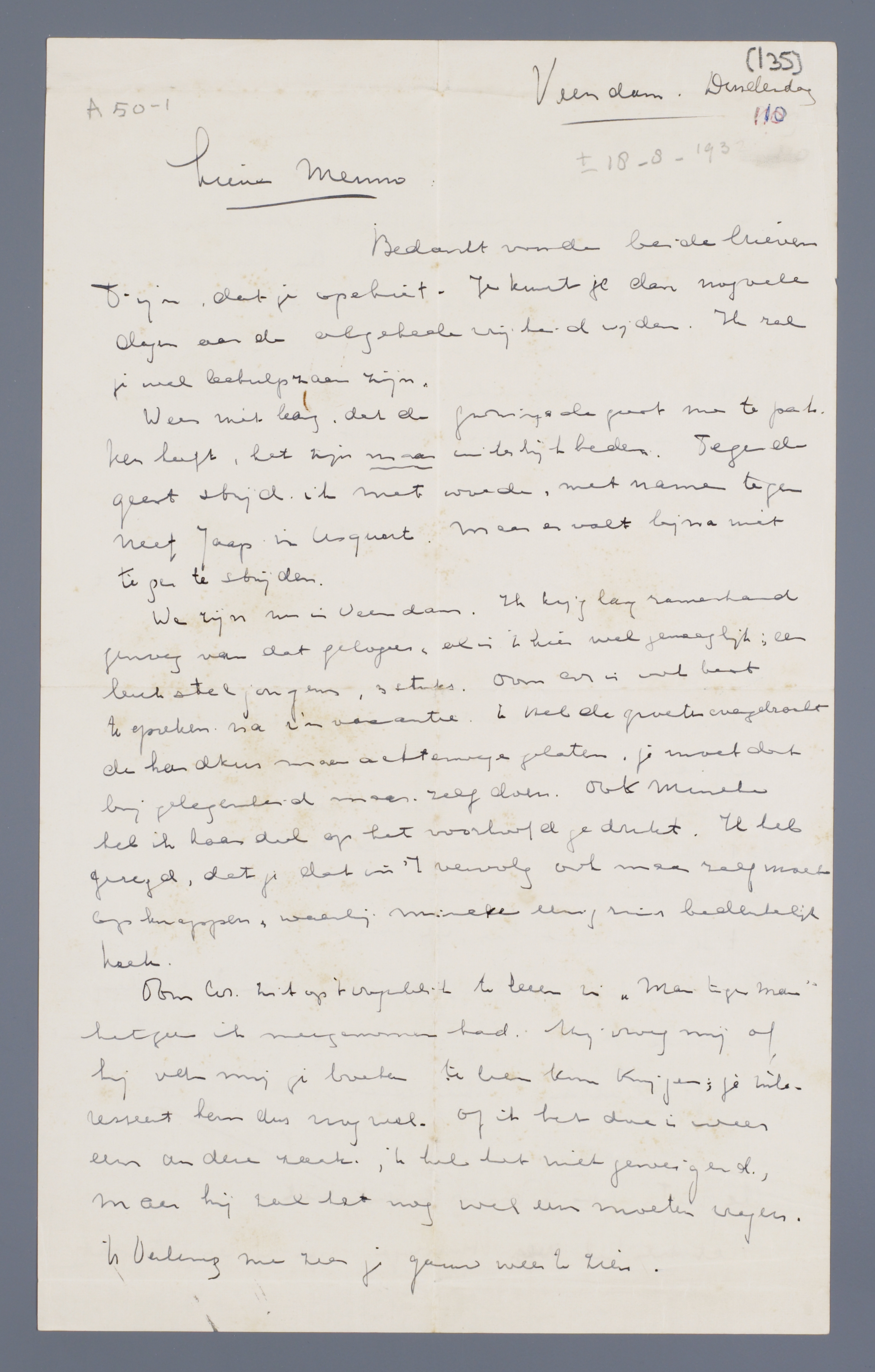 We zijn nu in Veendam. Ik krijg langzamerhand genoeg van dat gelogeer, al is 't hier wel genoeglijk; een leuk stel jongens, 3 stuks. Oom Cor is ook best te spreken na z'n vacantie. 'k Heb de groeten overgebracht, de handkus maar achterwege gelaten, je moet dat bij gelegenheid maar zelf doen. Ook Mineke heb ik haar deel op het voorhoofd gedrukt. Ik heb gezegd, dat je dat in 't vervolg ook maar zelf moet opknappen, waarbij Mineke eenigzins bedenkelijk keek.