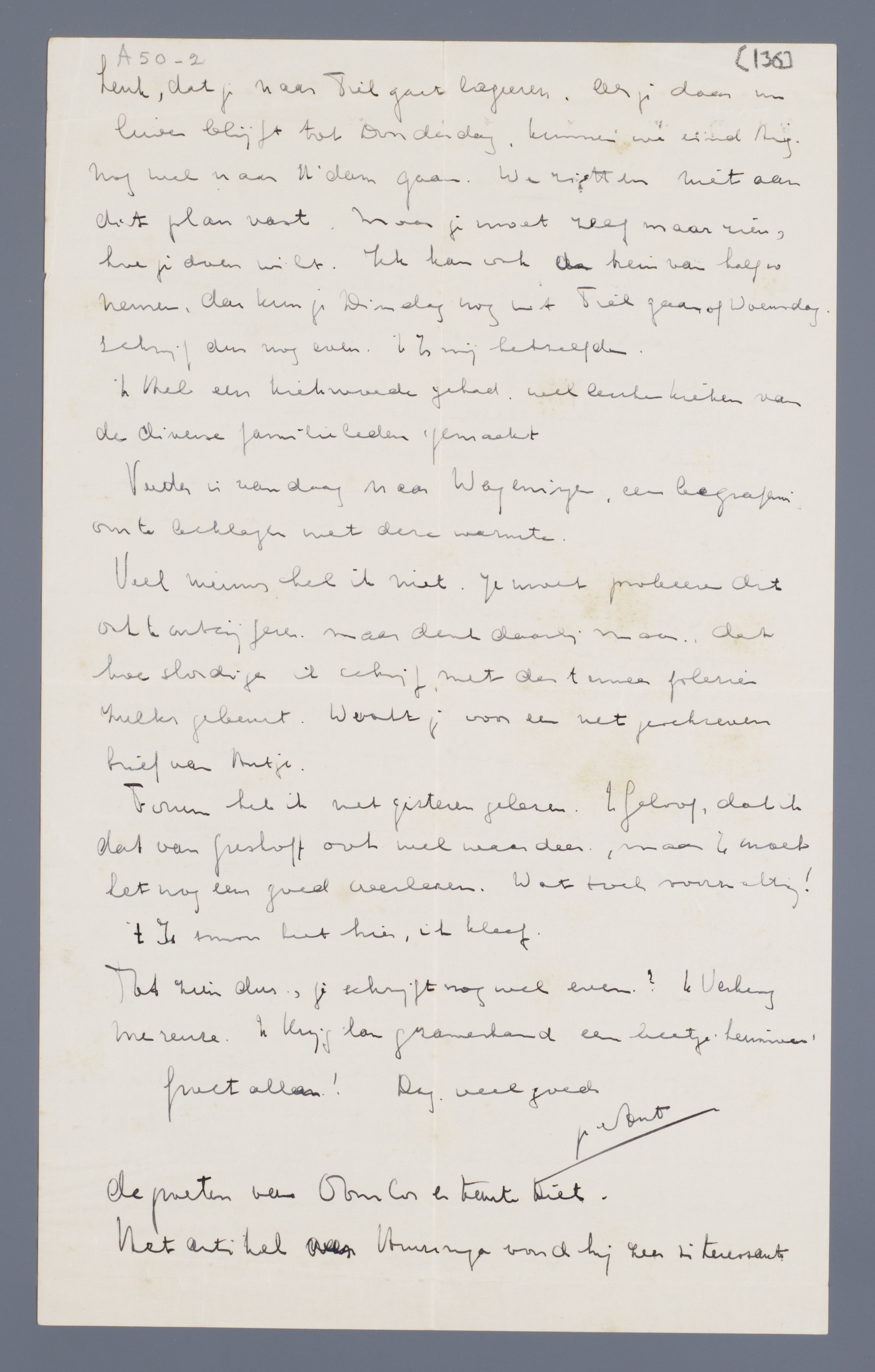 Veel nieuws heb ik niet. Je moet probeeren dit ook te ontcijferen, maar denk daarbij maar, dat hoe slordiger ik schrijf, met des te meer plezier zulks gebeurt. Wacht je voor een net geschreven brief van Antje.