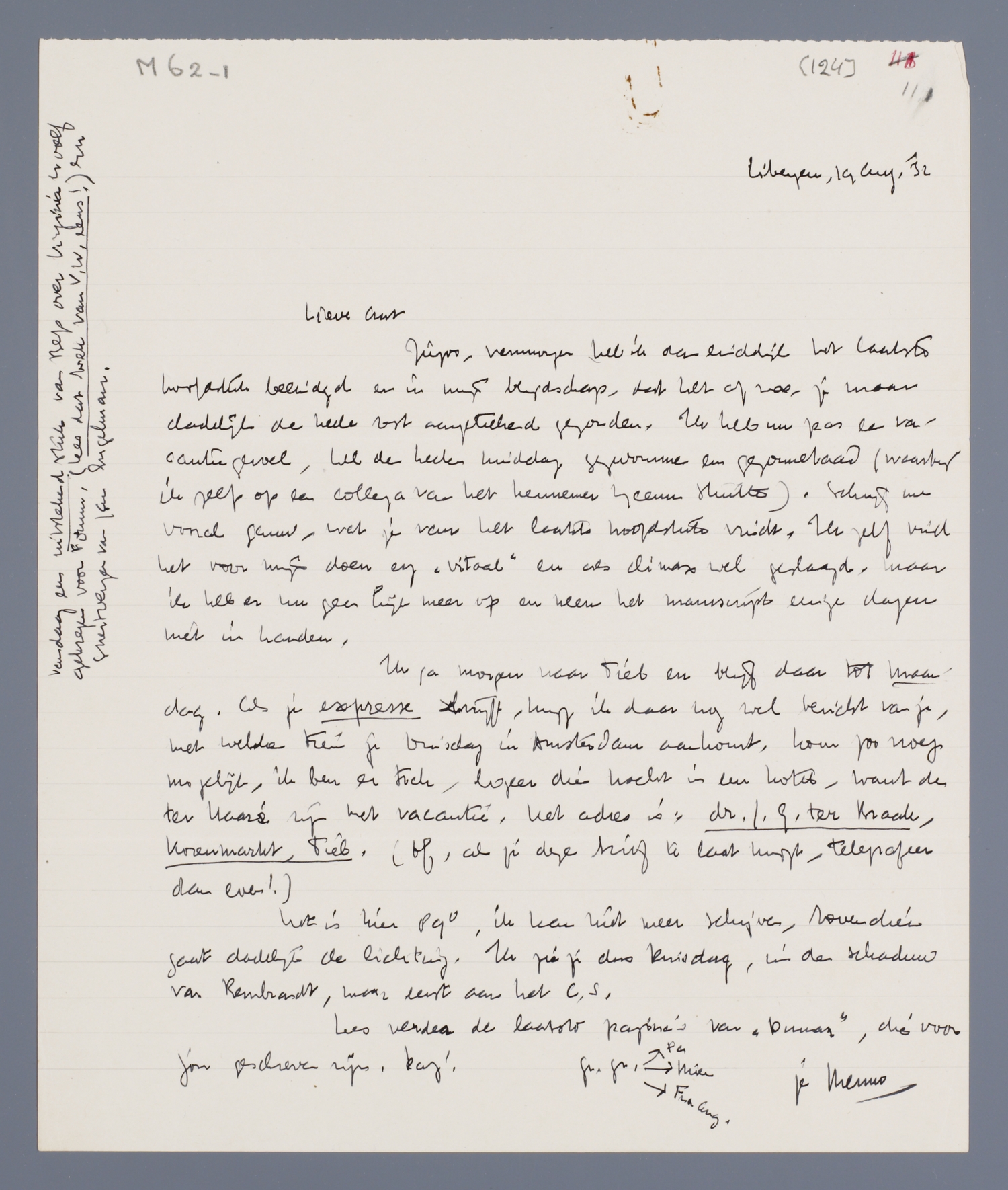 Het is hier 89°, ik kan niet meer schrijven, bovendien gaat dadelijk de lichting. Ik zie je dus Dinsdag, in den schaduw van Rembrandt, maar eerst aan het C.S.