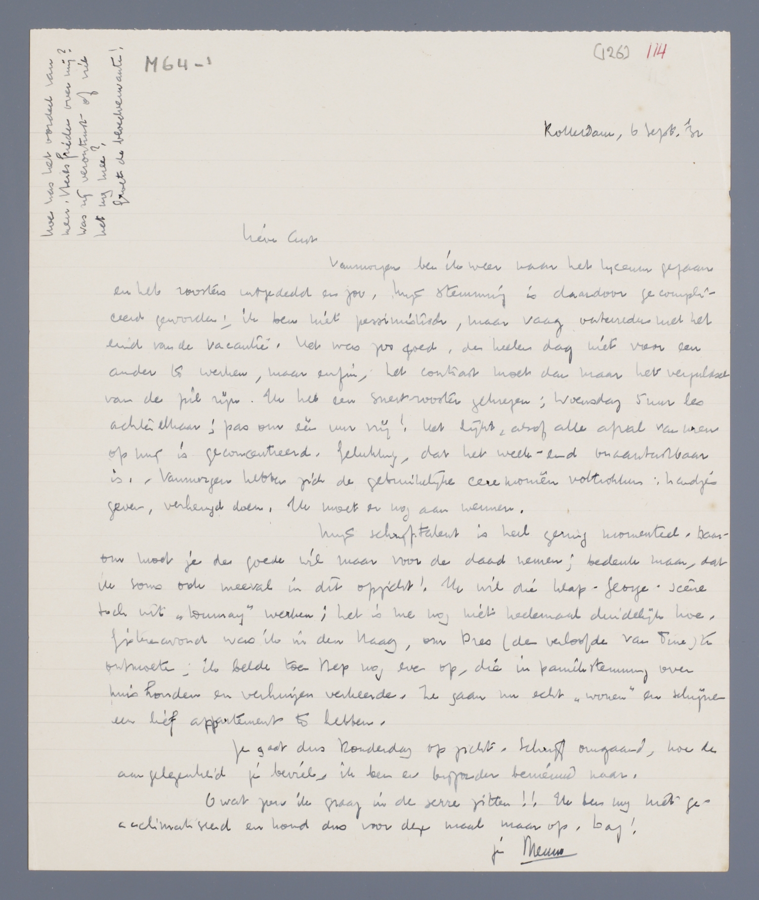 Mijn schrijftalent is heel gering momenteel. Daarom moet je de goede wil maar voor de daad nemen; bedenk maar, dat ik soms ook meeval in dit opzicht! Ik wil die klap-George-scêne toch uit ‘Dumay’ werken; het is me nog niet heelemaal duidelijk hoe. Gisterenavond was ik in den Haag, om Dres (den verloofde van Tine) te ontmoeten, ik belde toen Bep nog even op, die in paniekstemming over huishouden en verhuizen verkeerde. Ze gaan nu echt ‘wonen’ en schijnen een lief appartement te hebben.