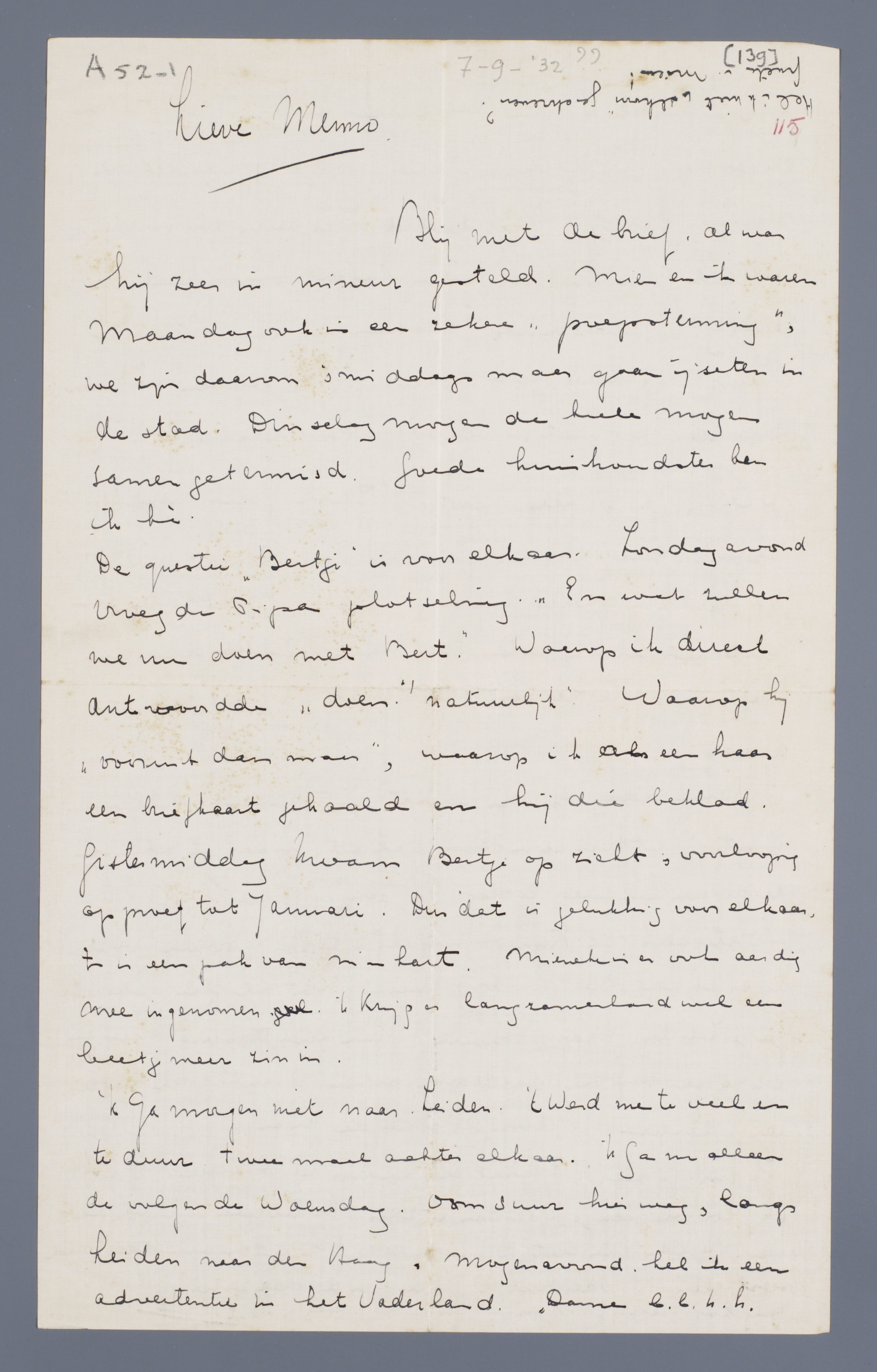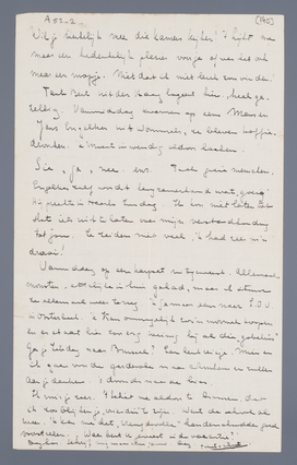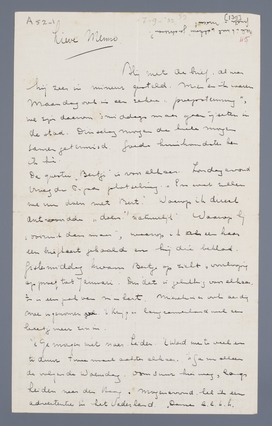 'k Ga morgen niet naar Leiden. 't Werd me te veel en te duur twee maal achter elkaar. 'k Ga nu alleen de volgende Woensdag. Om 8 uur hier weg, langs Leiden naar den Haag. Morgenavond heb ik een advertentie in het Vaderland. ‘Dame b.b.h.h.’ Wil je werkelijk mee die kamers kijken? 't Lijkt me maar een bedenkelijk plezier voor je of was het ook maar een mopje. Niet dat ik niet leuk zou vinden.