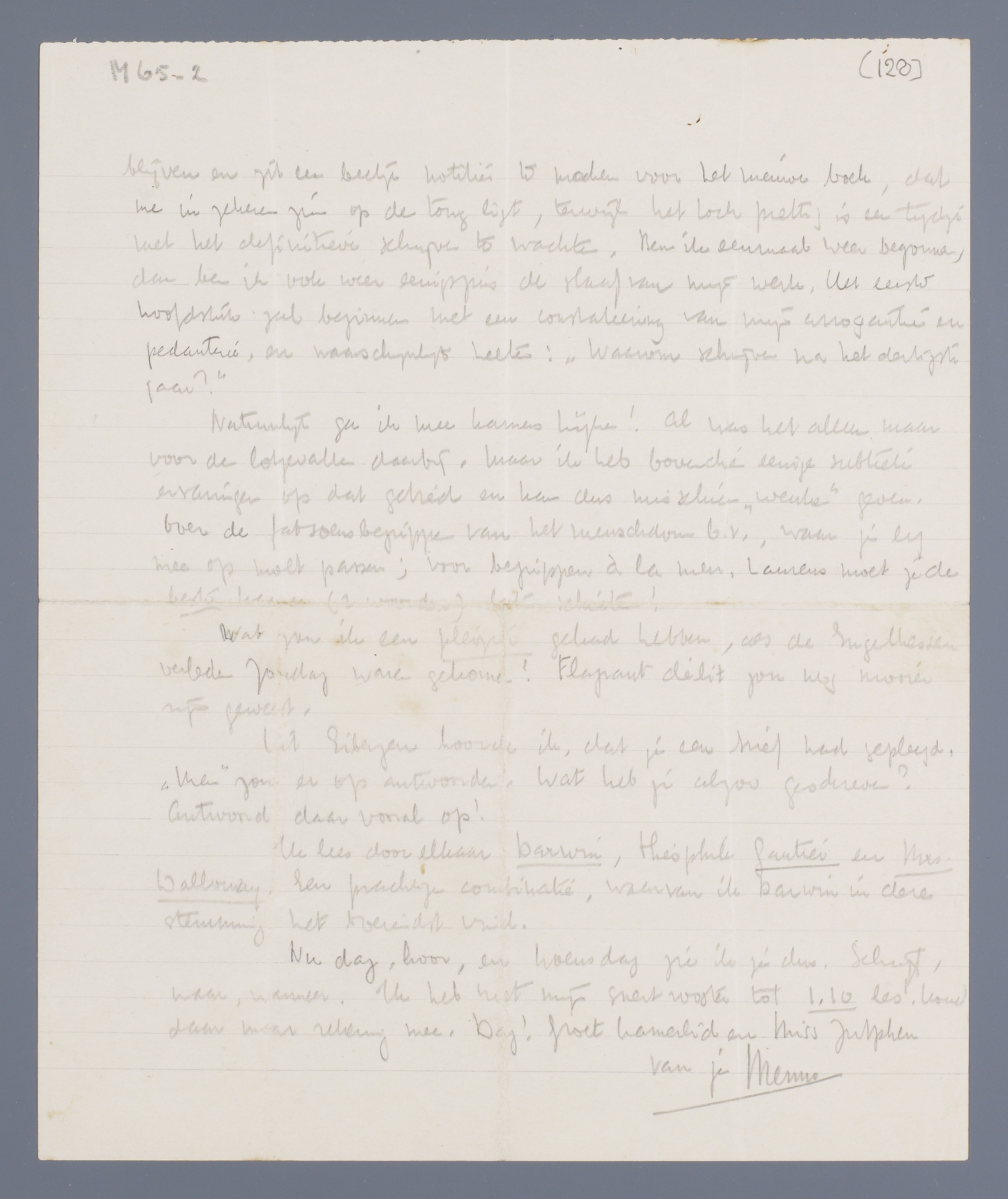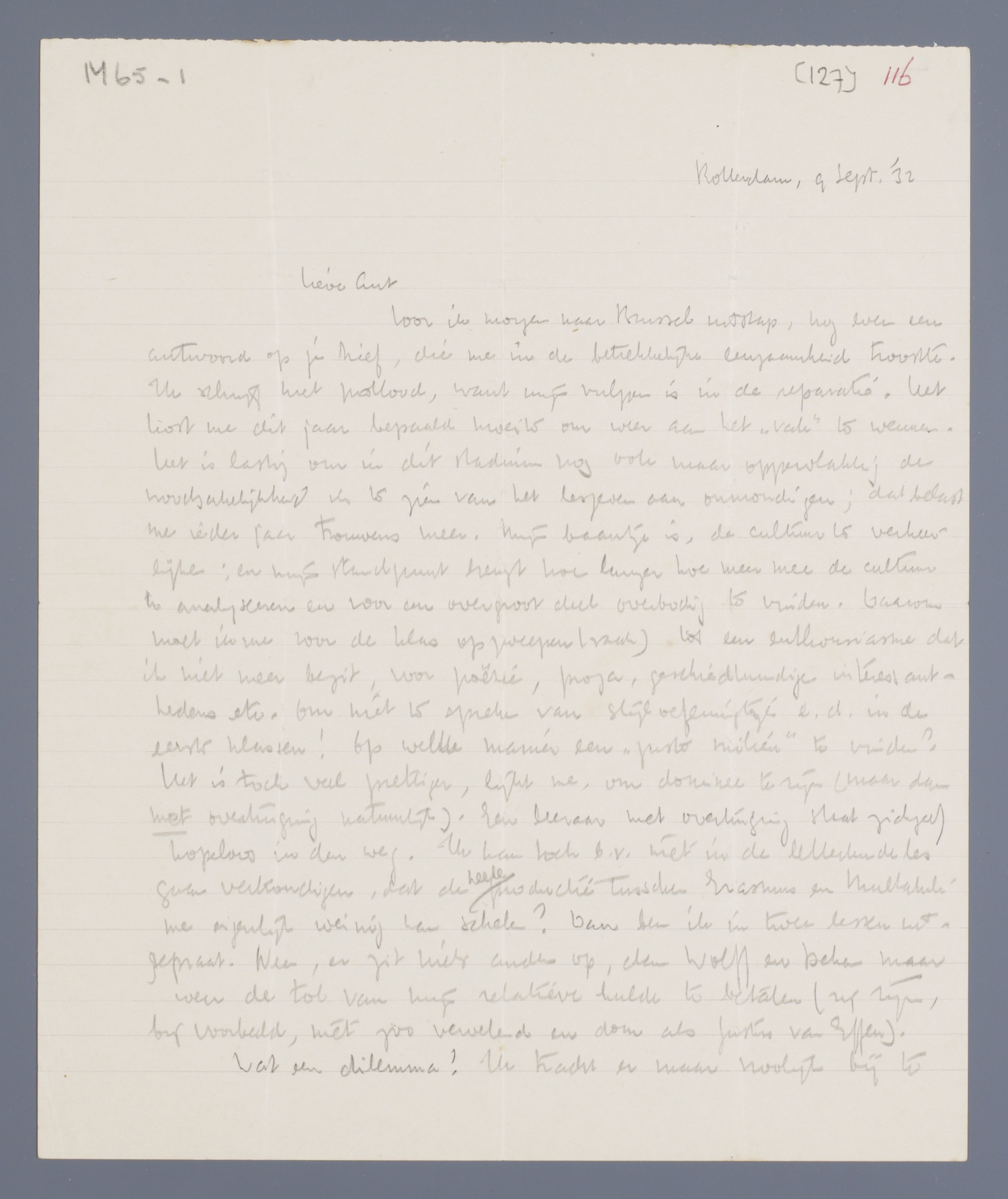 Voor ik morgen naar Brussel uitstap, nog even een antwoord op je brief, die me in de betrekkelijke eenzaamheid troostte. Ik schrijf met potlood, want mijn vulpen is in de reparatie. Het kost me dit jaar bepaald moeite om weer aan het ‘vak’ te wennen. Het is lastig om in dit stadium nog ook maar oppervlakkig de noodzakelijkheid in te zien van het lesgeven aan onmondigen; dat belast me ieder jaar trouwens meer. Mijn baantje is, de cultuur te verheerlijken; en mijn standpunt brengt hoe langer hoe meer mee de cultuur te analyseeren en voor een overgroot deel overbodig te vinden. Daarom moet ik me voor de klas opzweepen (vaak) tot een enthousiasme dat ik niet meer bezit, voor poëzie, proza, geschiedkundige interessanthedens etc. om niet te spreken van stijloefeningetjes e.d. in de eerste klassen! Op welke manier een ‘juste milieu’ te vinden? Het is toch veel prettiger, lijkt me, om dominee te zijn (maar dan met overtuiging natuurlijk). Een leeraar met overtuiging staat zichzelf hopeloos in den weg. Ik kan toch b.v. niet in de letterkundeles gaan verkondigen, dat de heele productie tusschen Erasmus en Multatuli me eigenlijk weinig kan schelen? Dan ben ik in twee lessen uitgepraat. Weer, er zit niets anders op, dan Wolff en Deken maar weer de tol van mijn relatieve hulde te betalen (zij zijn, bijvoorbeeld, niet zoo vervelend en dom als Justus van Effen).