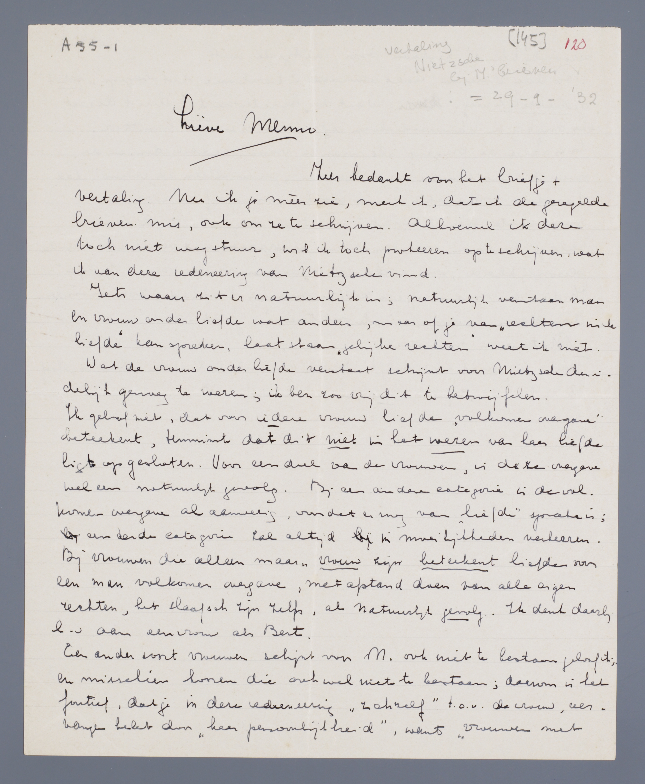 Zeer bedankt voor het briefje + vertaling. Nu ik je méer zie, merk ik, dat ik de geregelde brieven mis, ook om ze te schrijven. Alhoewel ik deze toch niet wegstuur, wil ik toch probeeren op te schrijven, wat ik van deze redeneering van Nietzsche vind.