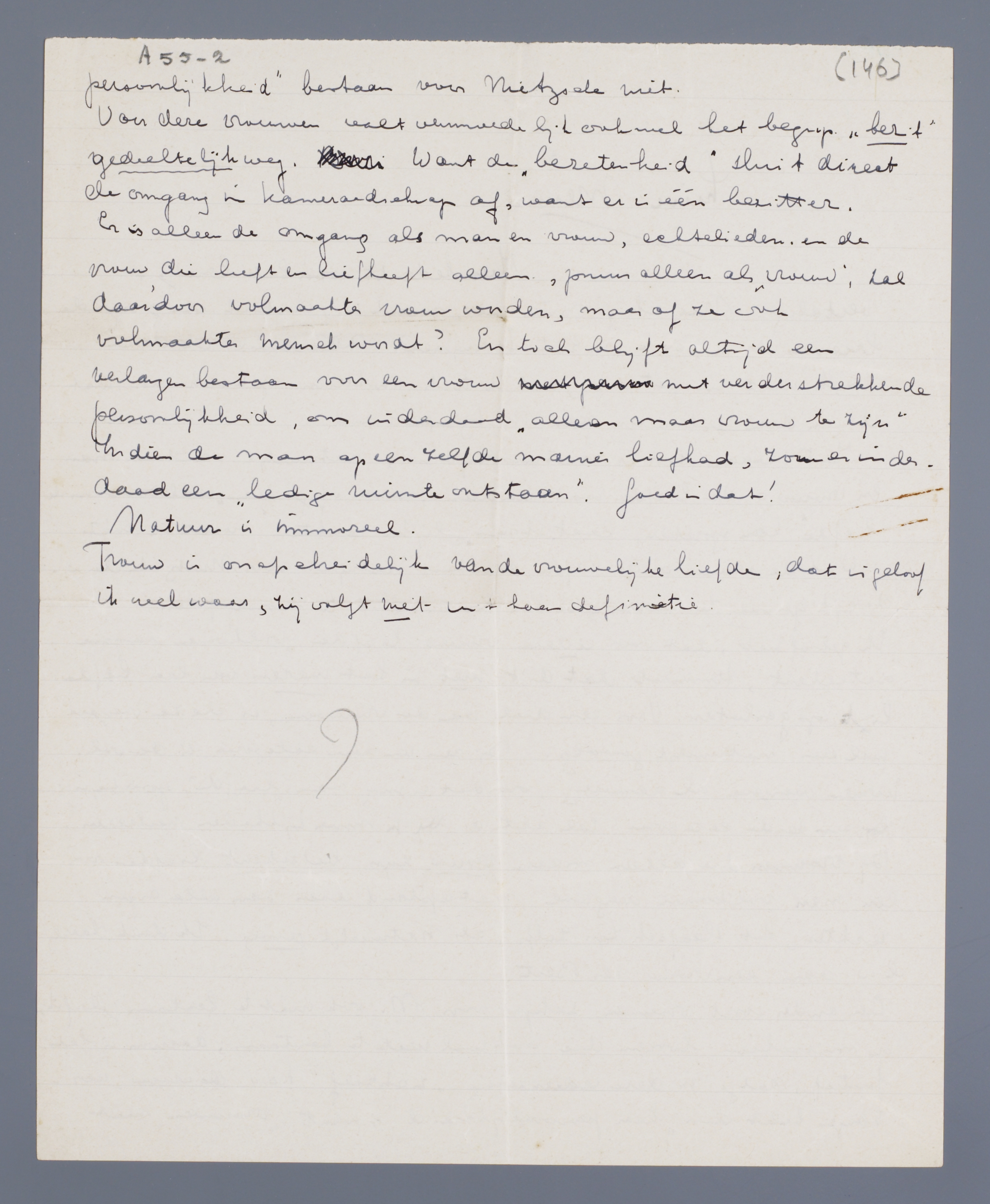 Voor deze vrouwen valt vermoedelijk ook wel het begrip ‘bezit’ gedeeltelijk weg. Want de ‘bezetenheid’ sluit direct de omgang in kameraadschap af, want er is één bezitter. Er is alleen de omgang als man en vrouw, echtelieden, en de vrouw die leeft en liefheeft alleen, puur alleen als ‘vrouw’, zal daardoor volmaakter vrouw worden, maar of ze ook volmaakter mensch wordt? En toch blijft altijd een verlangen bestaan voor een vrouw met verderstrekkende persoonlijkheid, om inderdaad ‘alleen maar vrouw te zijn’. Indien de man op een zelfde manier liefhad, zou er inderdaad een ‘ledige ruimte ontstaan’. Goed is dat!