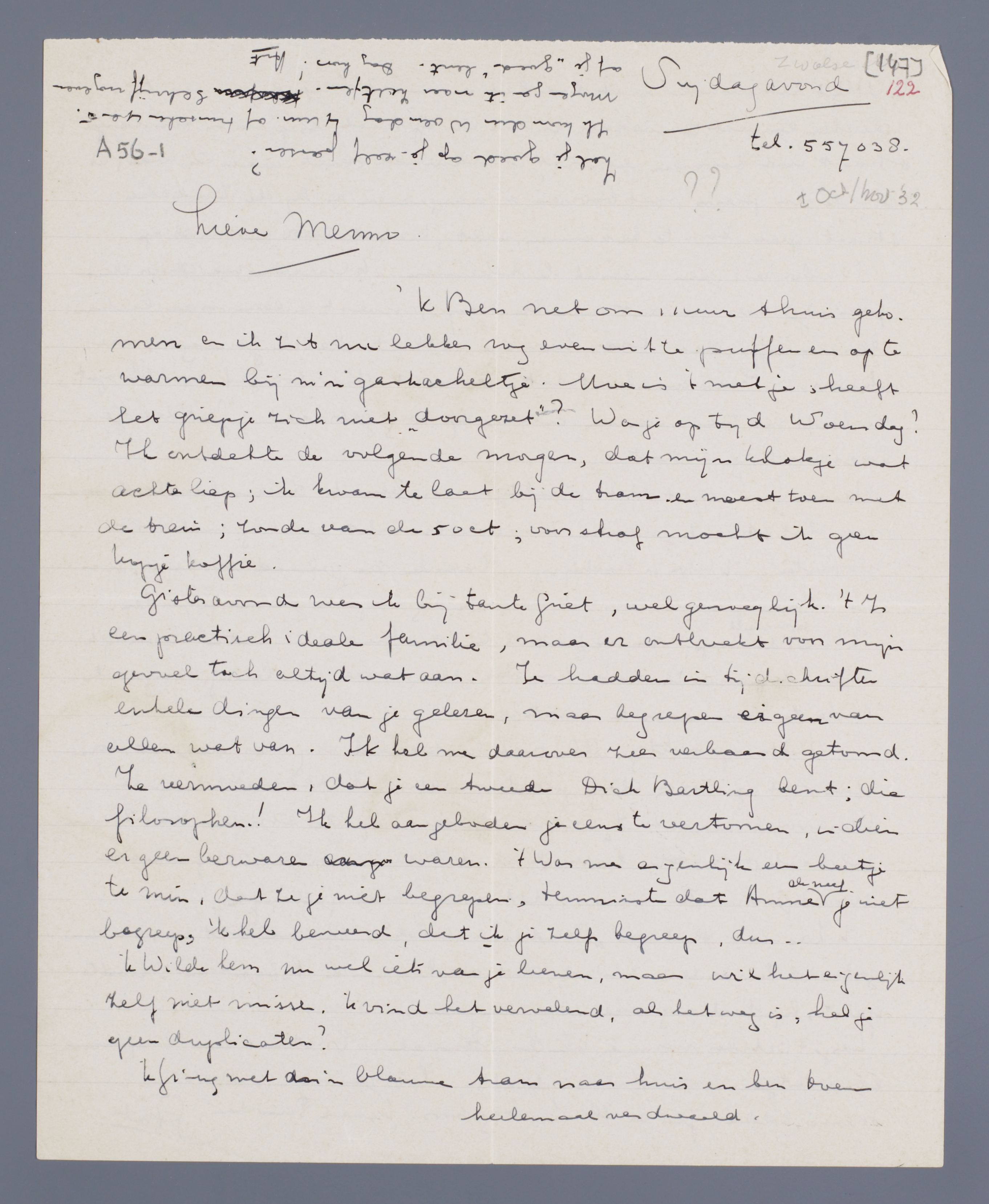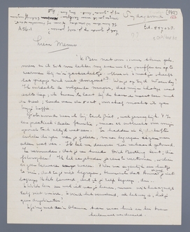 'k Ging met 'n blauwe tram naar huis en ben toen heelemaal verdwaald. 'k Weet heelemaal niet hoe het kwam. 'k Liep ergens over te denken en wat te soezen en toen ik opkeek liep ik in een lange straat met boomen en wist heelemaal niet waar ik was; er volgde een plein met boomen en aangezien er bij de Zwolschestraat geen boom te bekennen valt, keek ik zeer vreemd op. Pikdonker, geen mensch te bekennen. 'k Voelde me door dat pleintje zeer verwant aan Dumay, moest alleen maar lachen. Aan een juffr. die haar hondje uitliet heb ik gevraagd, waar ik was. Leuvenschestraat, je weet, die zoo gek rondloopt, ze heeft me toen weer een eindje op weg gebracht. Gekke gewaarwording is dat.