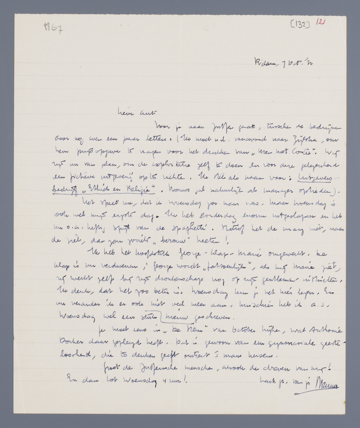 Voor je naar Zutfen gaat, tusschen de bedrijven door nog even een paar letters. (Ik moet n.l. vanavond naar Zijlstra, om hem prijsopgave te vragen voor het drukken van ‘Uren met Coster’. Wij zijn nu van plan, om de exploitatie zelf te doen en voor deze gelegenheid een fictieve uitgeverij op te richten. Ik stel als naam voor: Uitgeversbedrijf ‘Ethiek en Religie’. Bouws zal natuurlijk als manager optreden).