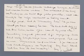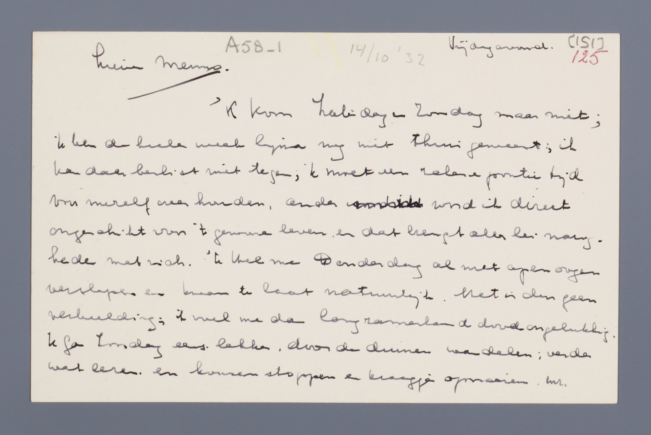 'k Kom Zaterdag en Zondag maar niet; 'k ben de heele week bijna nog niet thuis geweest; ik kan daar beslist niet tegen, 'k moet een zekere portie tijd voor mezelf over houden, anders word ik direct ongeschikt voor 't gewone leven en dat brengt allerlei narigheden met zich. 'k Heb me Donderdag al met open oogen verslapen en kwam te laat natuurlijk. Het is dus geen verbeelding; ik voel me dan langzamerhand doodongelukkig. 'k Ga Zondag eens lekker door de duinen wandelen; verder wat lezen en kousen stoppen en kraagjes opnaaien enz.