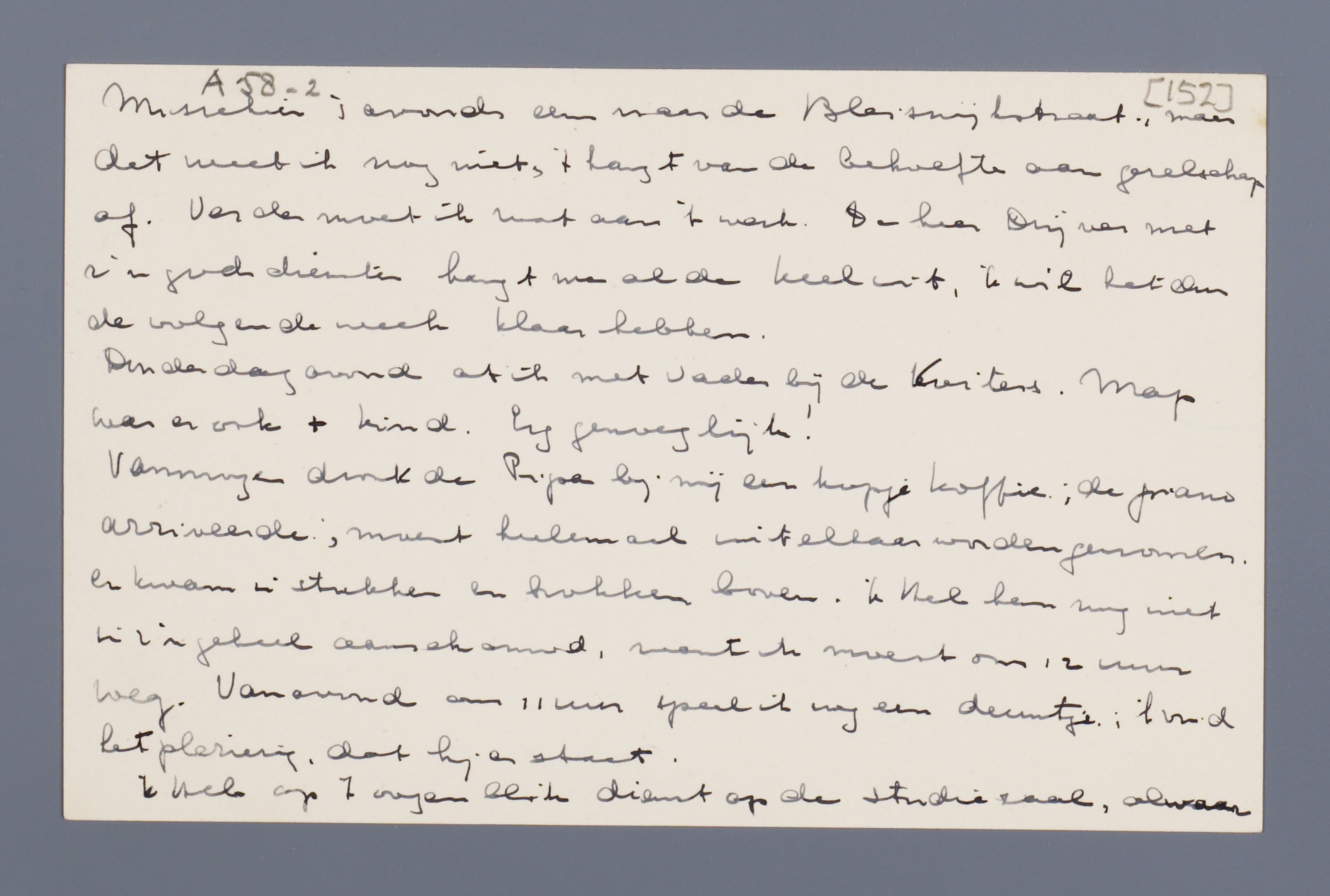 Vanmorgen dronk de Pipa bij mij een kopje koffie; de piano arriveerde, moest heelemaal uit elkaar worden genomen en kwam in stukken en brokken boven. 'k Heb hem nog niet in z'n geheel aanschouwd, want ik moest om 12 uur weg. Vanavond om 11 uur speel ik nog een deuntje, 'k vind het plezierig, dat hij er staat.