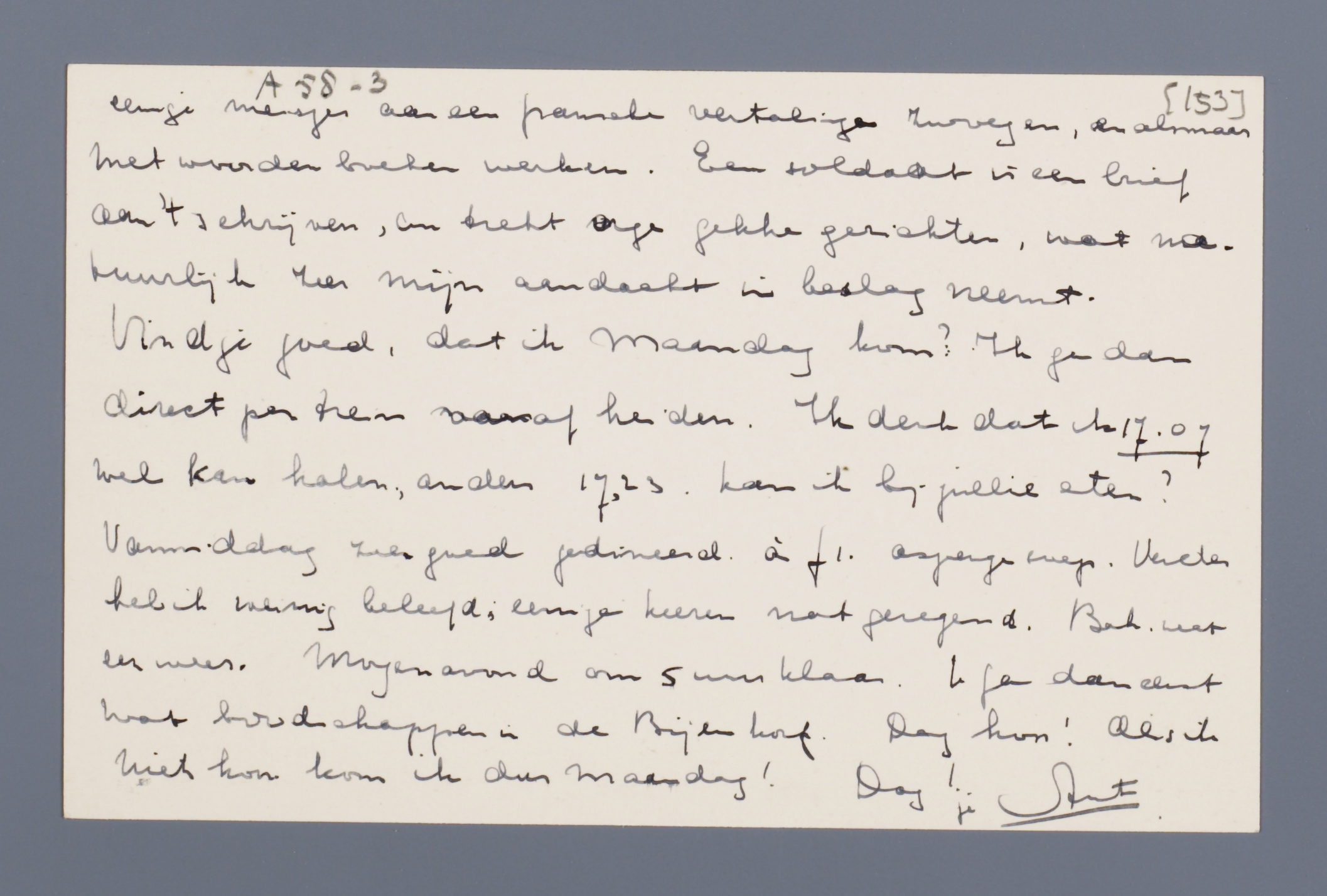 'k Heb op 't oogenblik dienst op de studiezaal, alwaar eenige meisjes aan een fransche vertaling zwoegen, en alsmaar met woordenboeken werken. Een soldaat is een brief aan 't schrijven, en trekt erge gekke gezichten, wat natuurlijk zeer mijn aandacht in beslag neemt.