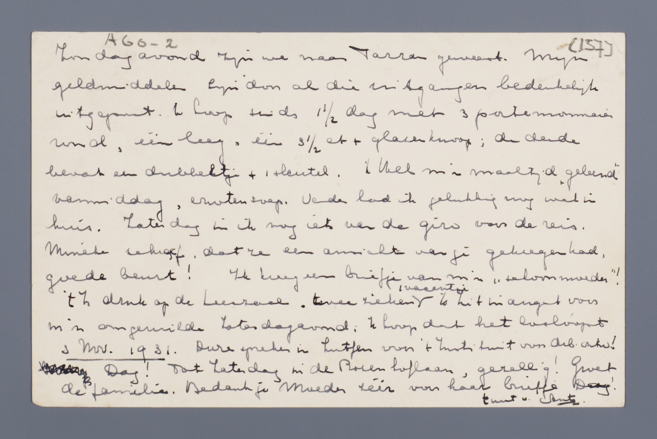 Zondagavond zijn we naar Tarzan geweest. Mijn geldmiddelen zijn door die uitgangen bedenkelijk uitgeput. 'k Loop sinds 1½ dag met 3 portemonnaies rond, één leeg, één 3½ ct + glazen knoop; de derde bevat een dubbeltje + 1 sleutel. 'k Heb m'n maaltijd ‘geleend’ vanmiddag, erwtensoep. Verder had ik gelukkig nog wat in huis. Zaterdag in ik nog iets van de giro voor de reis.