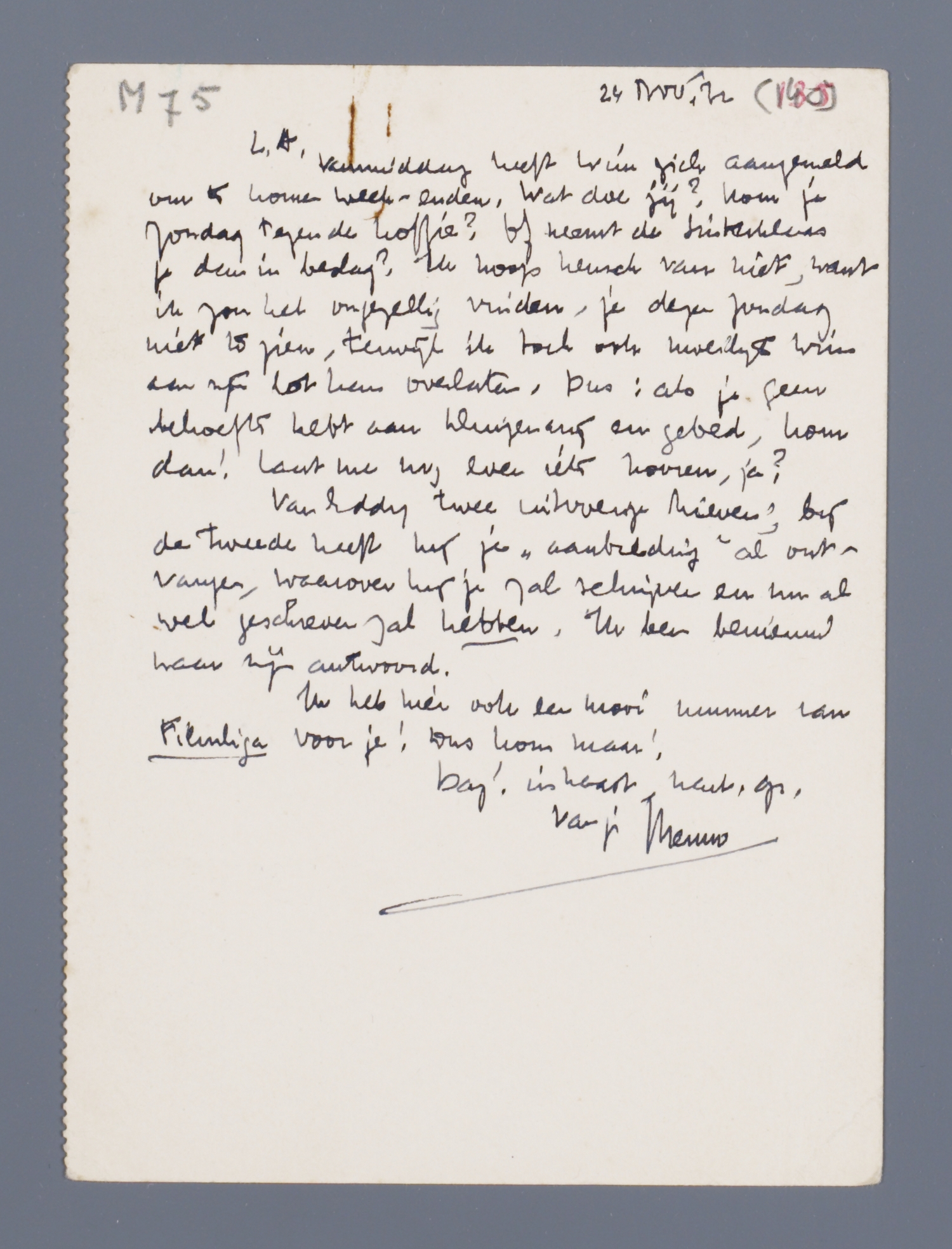 Vanmiddag heeft Wim zich aangemeld om te komen week-enden. Wat doe jij? Kom je Zondag tegen de koffie? Of neemt de Sinterklaas je dan in beslag? Ik hoop heusch van niet, want ik zou het ongezellig vinden, je dezen Zondag niet te zien, terwijl ik toch ook moeilijk Wim aan zijn lot kan overlaten. Dus: als je geen behoefte hebt aan kluizenarij en gebed, kom dan! Laat me nog even iets hooren, ja?