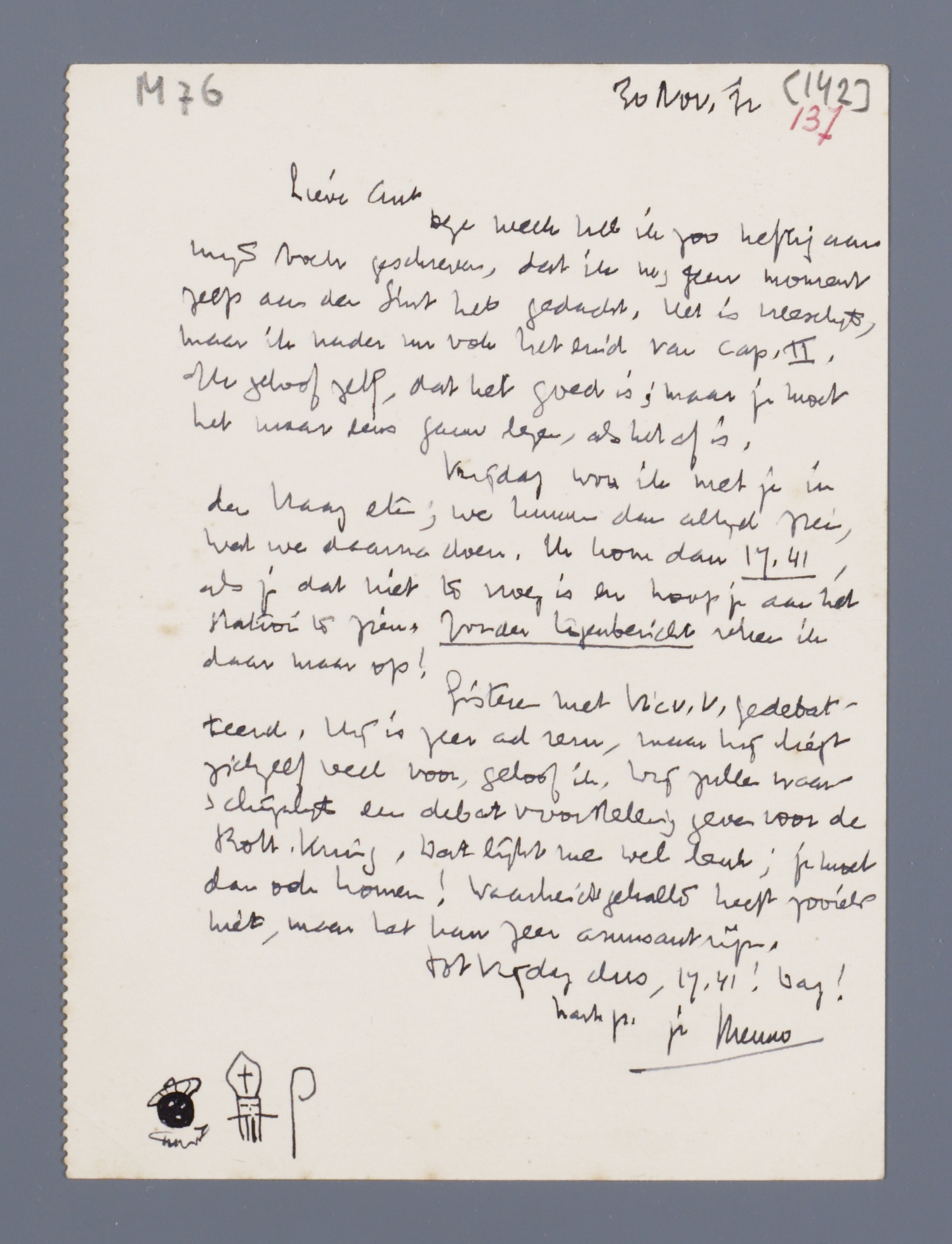 Gisteren met Vic v. V. gedebatteerd. Hij is zeer ad rem, maar hij liegt zichzelf veel voor, geloof ik. Wij zullen waarschijnlijk een debatvoorstelling geven voor de Rott. Kring. Dat lijkt me wel leuk; je moet dan ook komen! Waarheidsgehalte heeft zooiets niet, maar het kan zeer amusant zijn.
