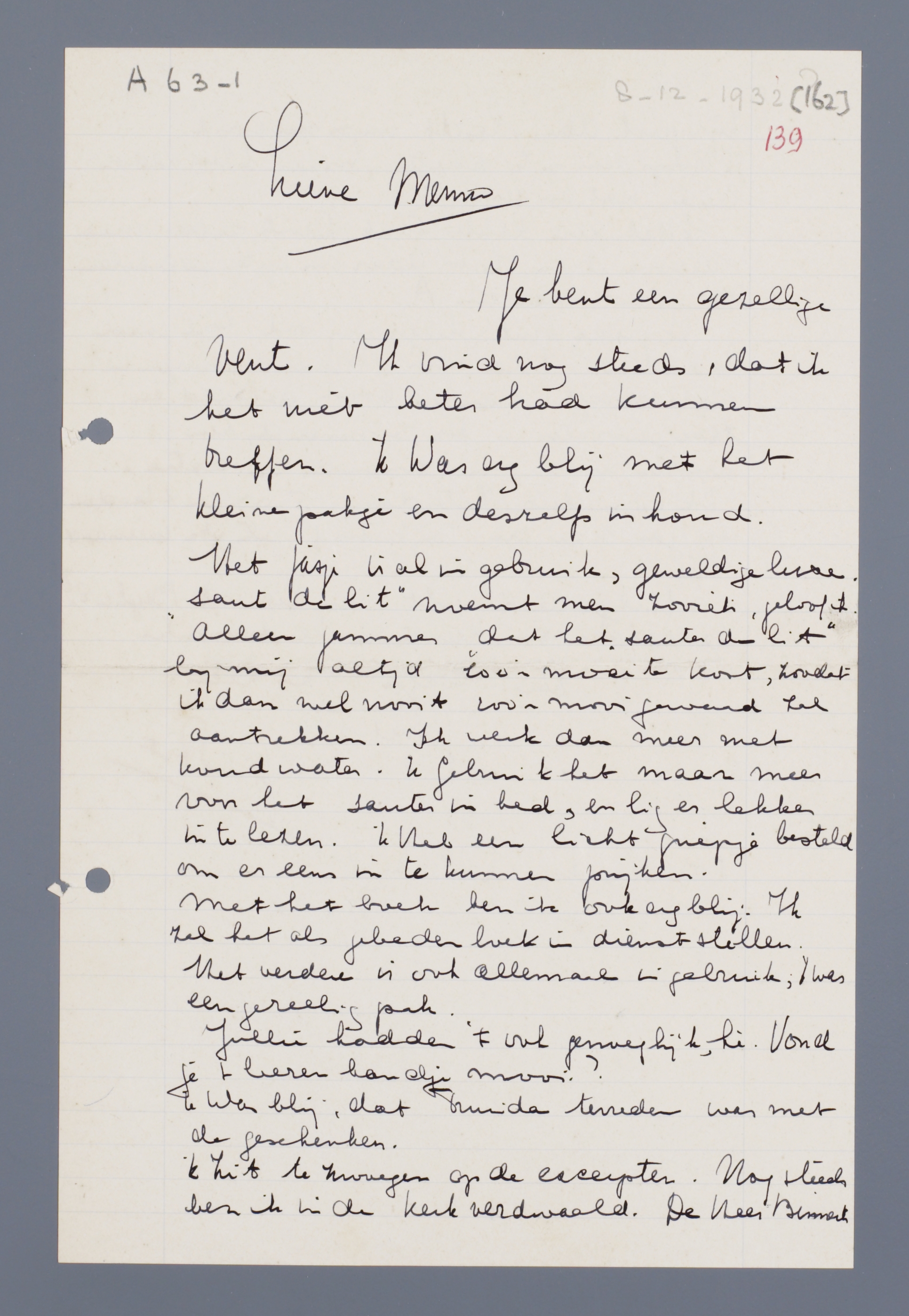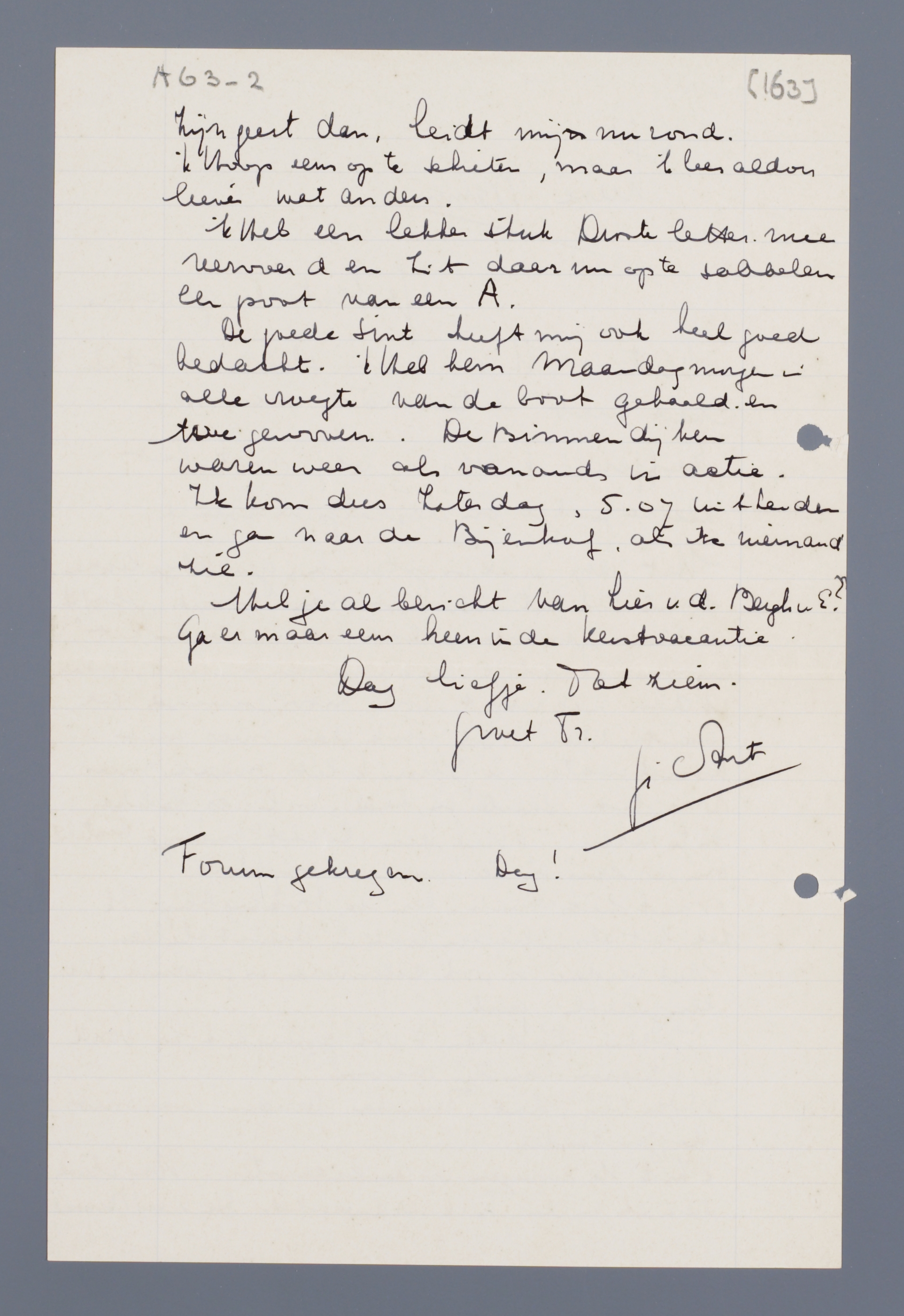 Het jasje is al in gebruik, geweldige luxe, ‘saut de lit’ noemt men zooiets, geloof ik. Alleen jammer dat het ‘sauter de lit’ bij mij altijd zoo'n moeite kost, zoodat ik dan wel nooit zoo'n mooi gewaad zal aantrekken. Ik werk dan meer met koud water. 'k Gebruik het maar meer voor het sauter in bed, en lig er lekker in te lezen. 'k Heb een licht griepje besteld om er eens in te kunnen prijken.