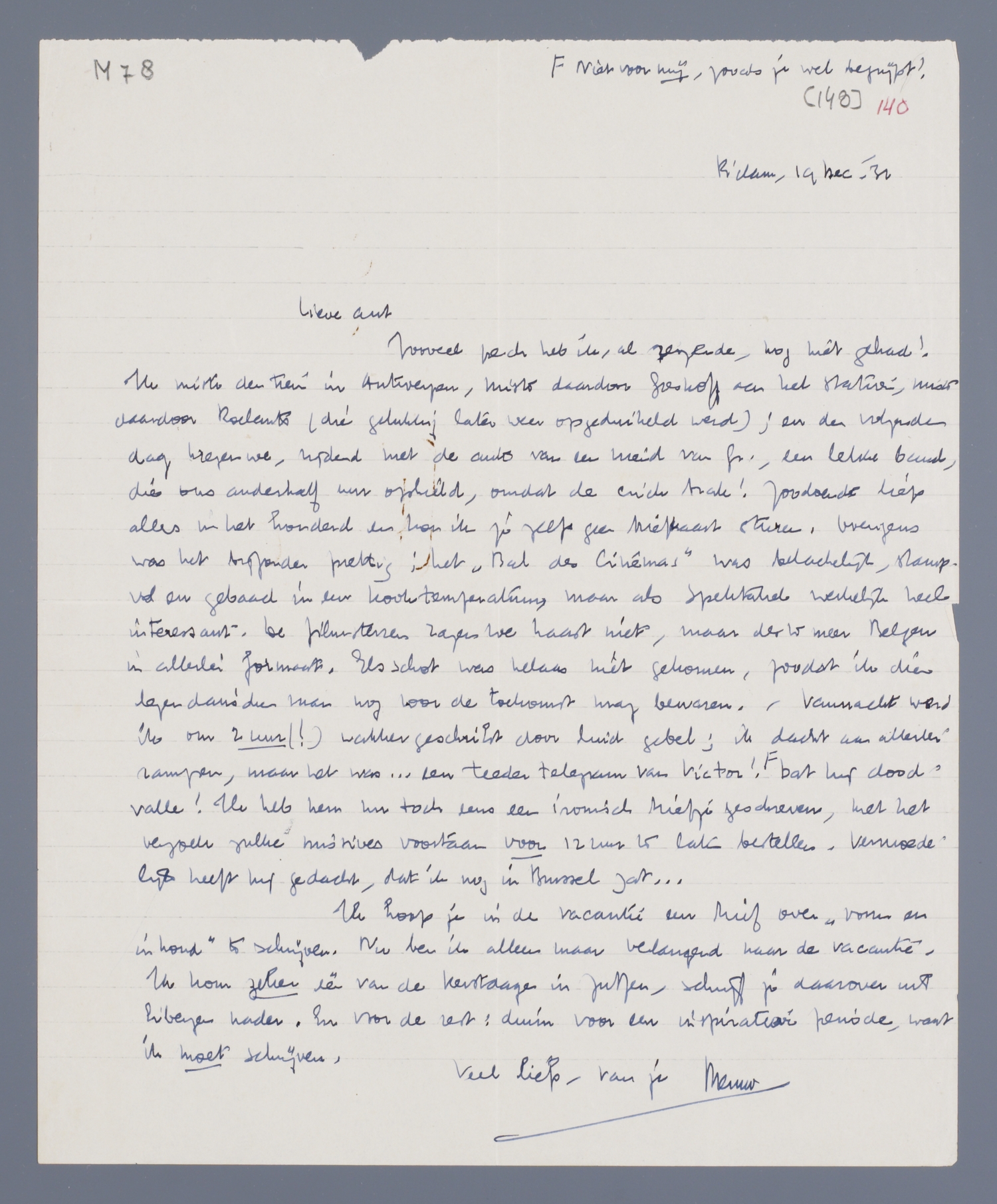 Ik hoop je in de vacantie een brief over ‘vorm en inhoud’ te schrijven. Nu ben ik alleen maar verlangend naar de vacantie. Ik kom zeker één van de Kerstdagen in Zutfen, schrijf je daarover uit Eibergen nader. En voor de rest: duim voor een inspiratoire periode, want ik moet schrijven.