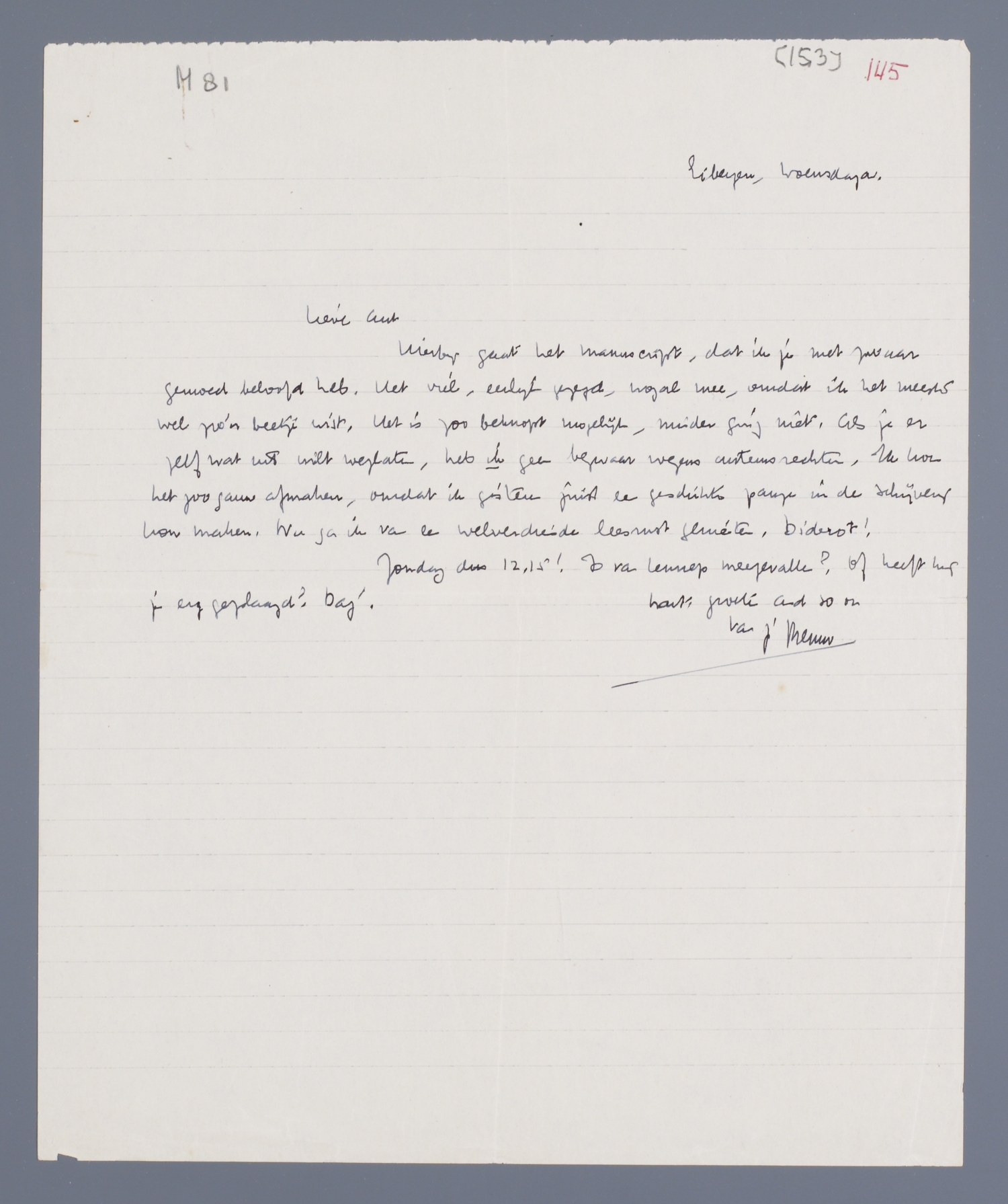 Hierbij gaat het manuscript, dat ik je met zwaar gemoed beloofd heb. Het viel, eerlijk gezegd, nogal mee, omdat ik het meeste wel zoo'n beetje wist. Het is zoo beknopt mogelijk, minder ging niet. Als je er zelf wat uit wilt weglaten, heb ik geen bezwaar wegens auteursrechten. Ik kon het zoo gauw afmaken, omdat ik gisteren juist een geschikte pauze in de schrijverij kon maken. Nu ga ik van een welverdiende leesrust genieten. Diderot!